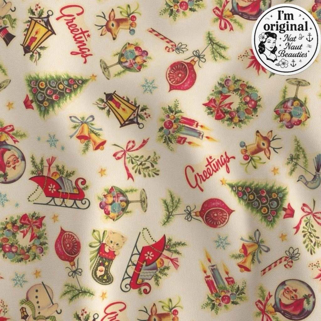Handmade from dreamy retro-inspired fabric adorned with classic mid-century motifs — think jolly Santas, reindeer, candy canes, wreaths, and golden bells — this full, twirl-ready circle skirt embodies timeless holiday charm. The creamy background and soft painterly illustrations evoke the glow of vintage Christmas cards and department store window displays.