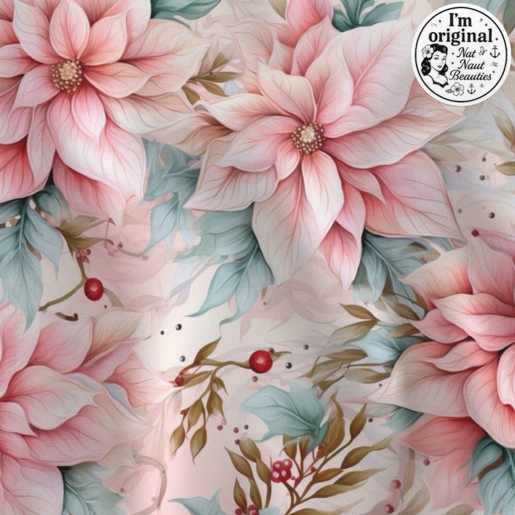 Handmade from luxuriously soft fabric adorned with sweeping poinsettias in shades of blush pink, frosted ivory, and minty sage, this 1950s-style circle skirt embodies elegance with a touch of nostalgia. Its painterly florals feel like vintage Christmas cards brought to life, exuding both classic femininity and modern sophistication.