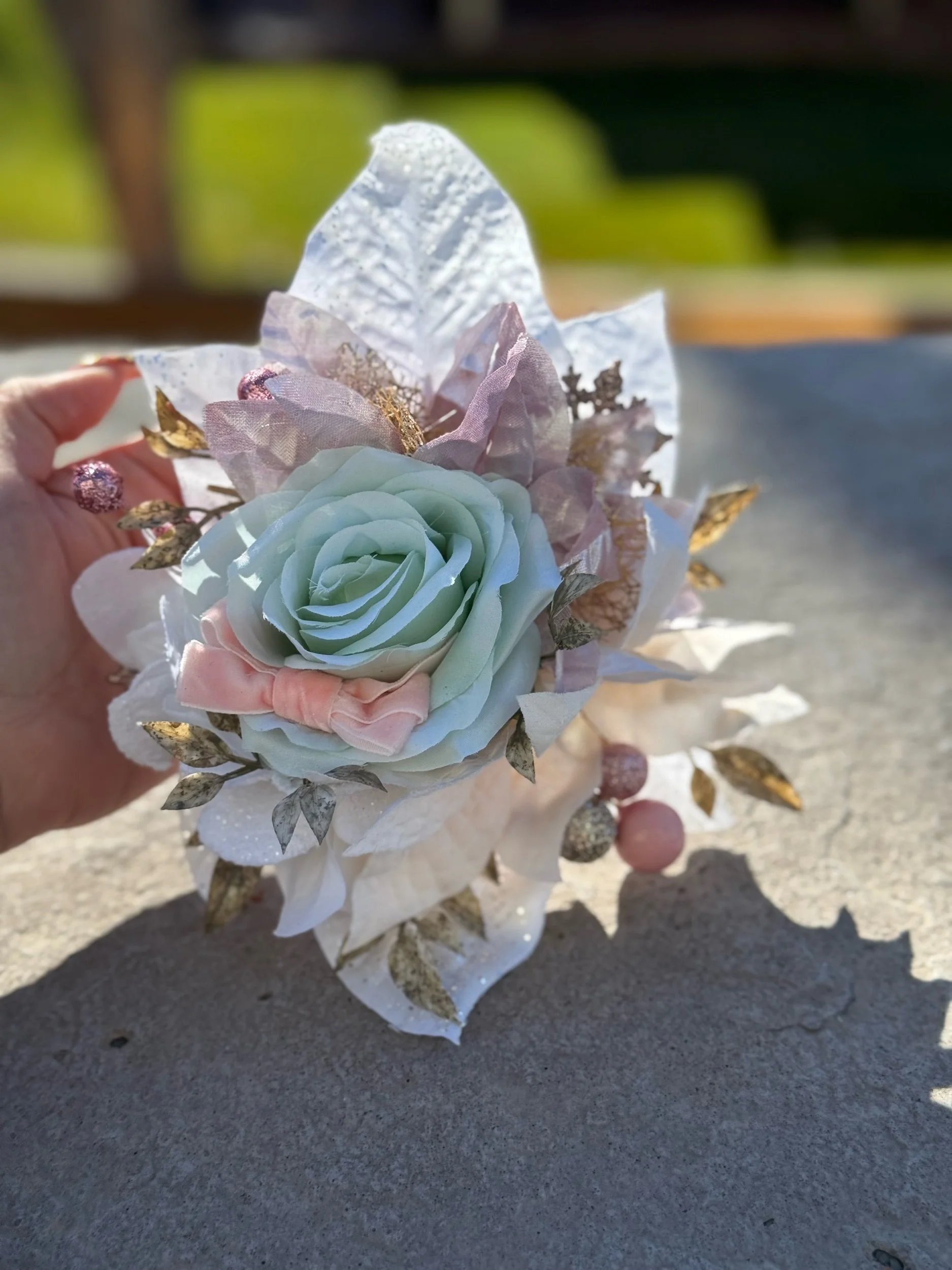 The matching Nat Naut Beauties hair flower is a winter masterpiece. Featuring a frosted mint rose accented with shimmering gold leaves, blush berries, glittering poinsettias, and a soft pink velvet bow, it’s as graceful as a snowflake and as enchanting as a 1950s Christmas ball.