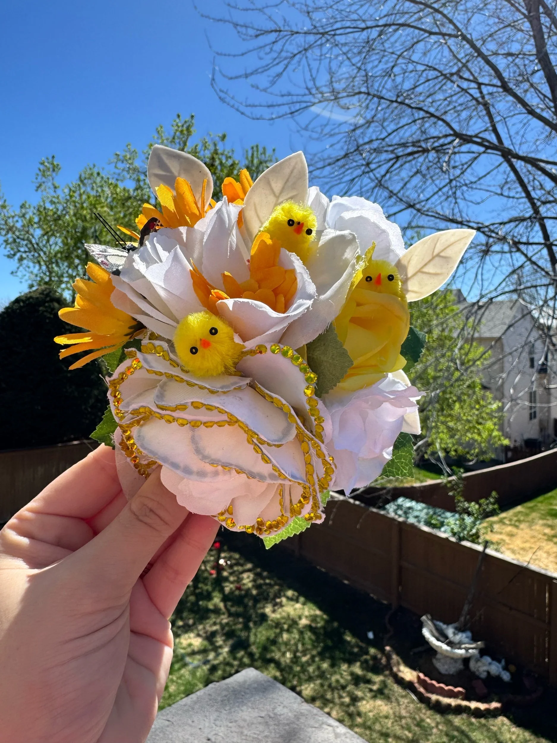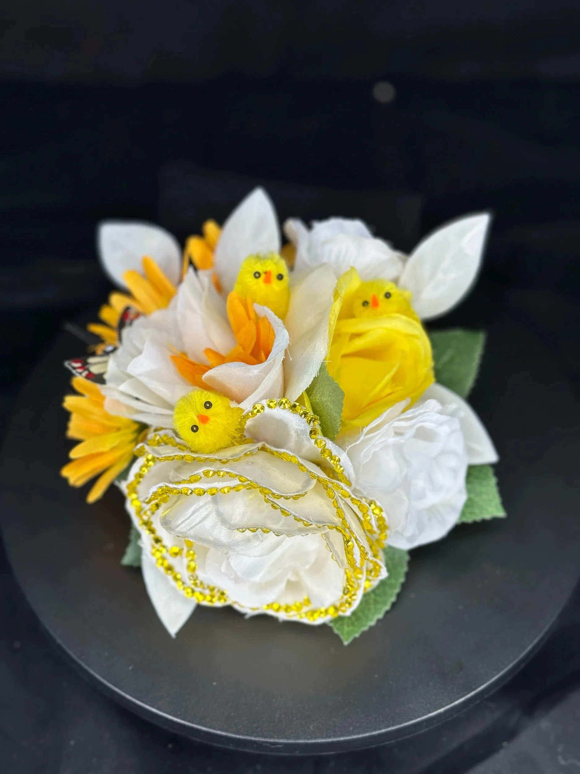 • Artisanal Wood Flowers: Featuring a large, sunshine-yellow Sola wood flower as a structural anchor, providing a unique organic texture that lasts forever.