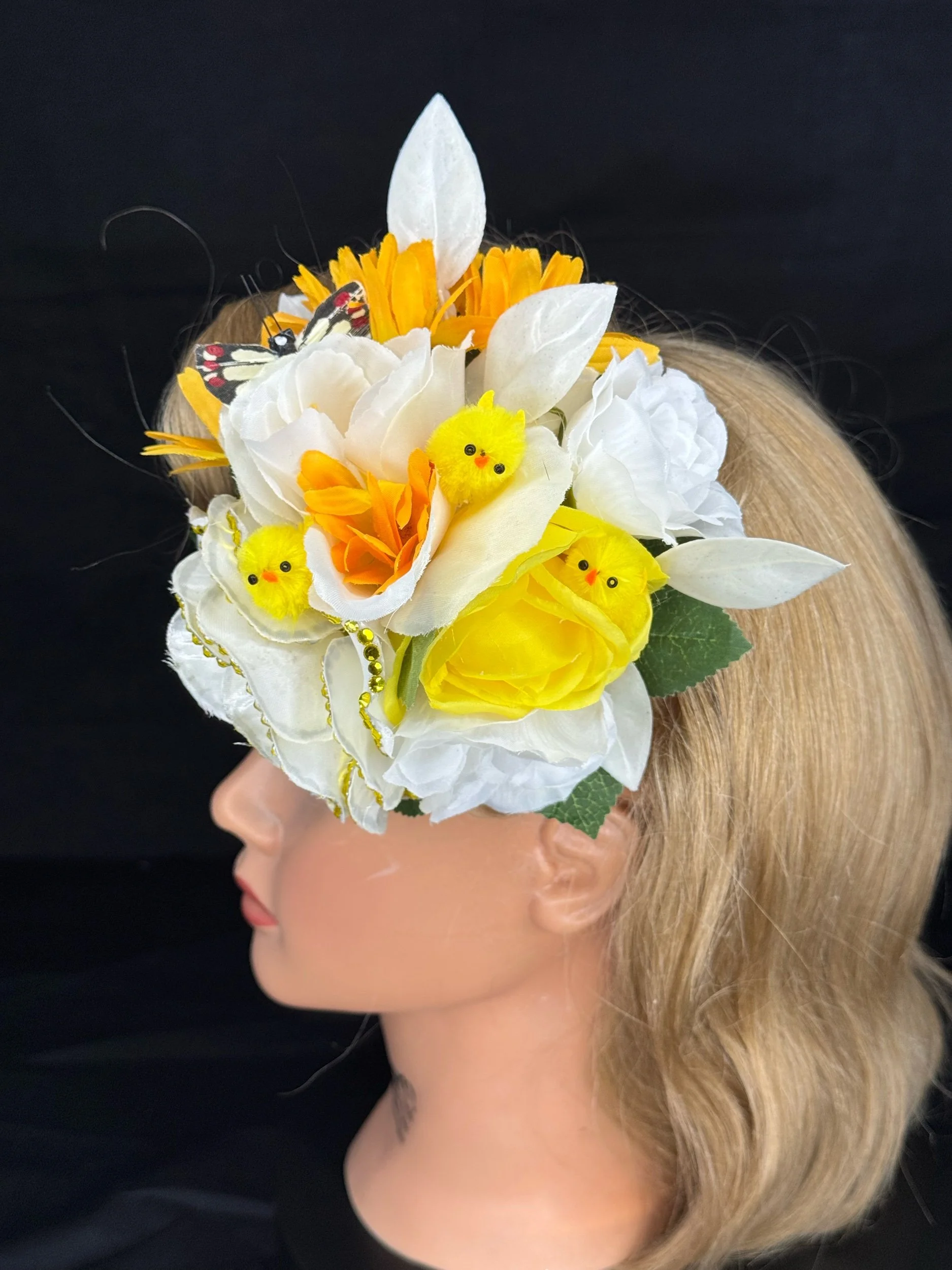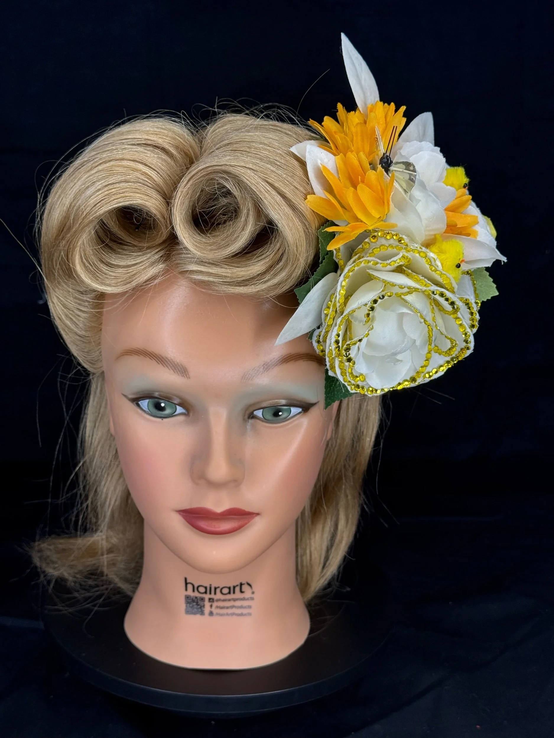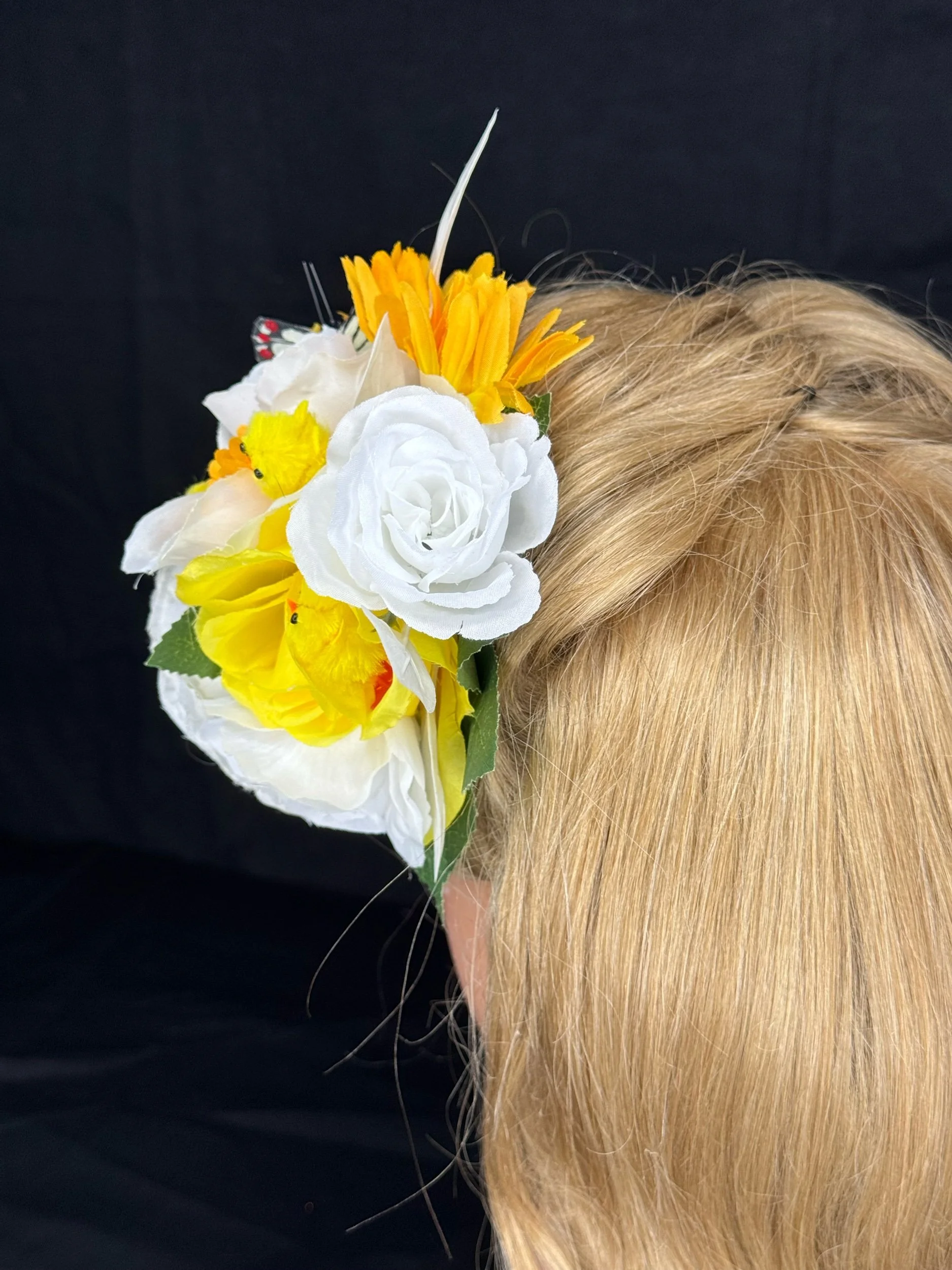 Get ready to be the queen of the garden with “What’s the BUZZ,” a vibrant, mixed-media hairpiece that celebrates the pollinators of spring. This design is an architectural delight, pairing the structural beauty of hand-planed wood flowers with soft, romantic silks and playful, whimsical accents.