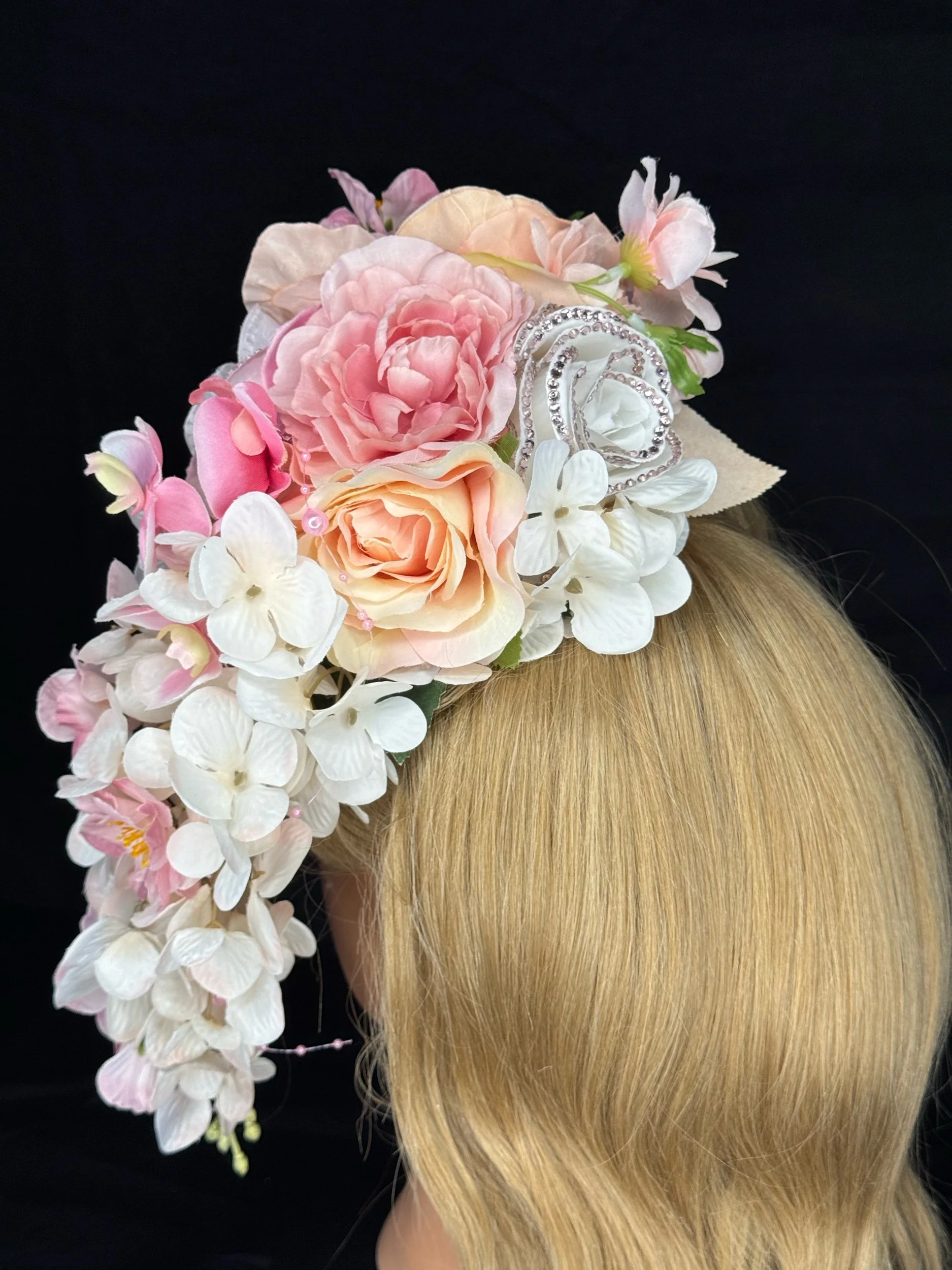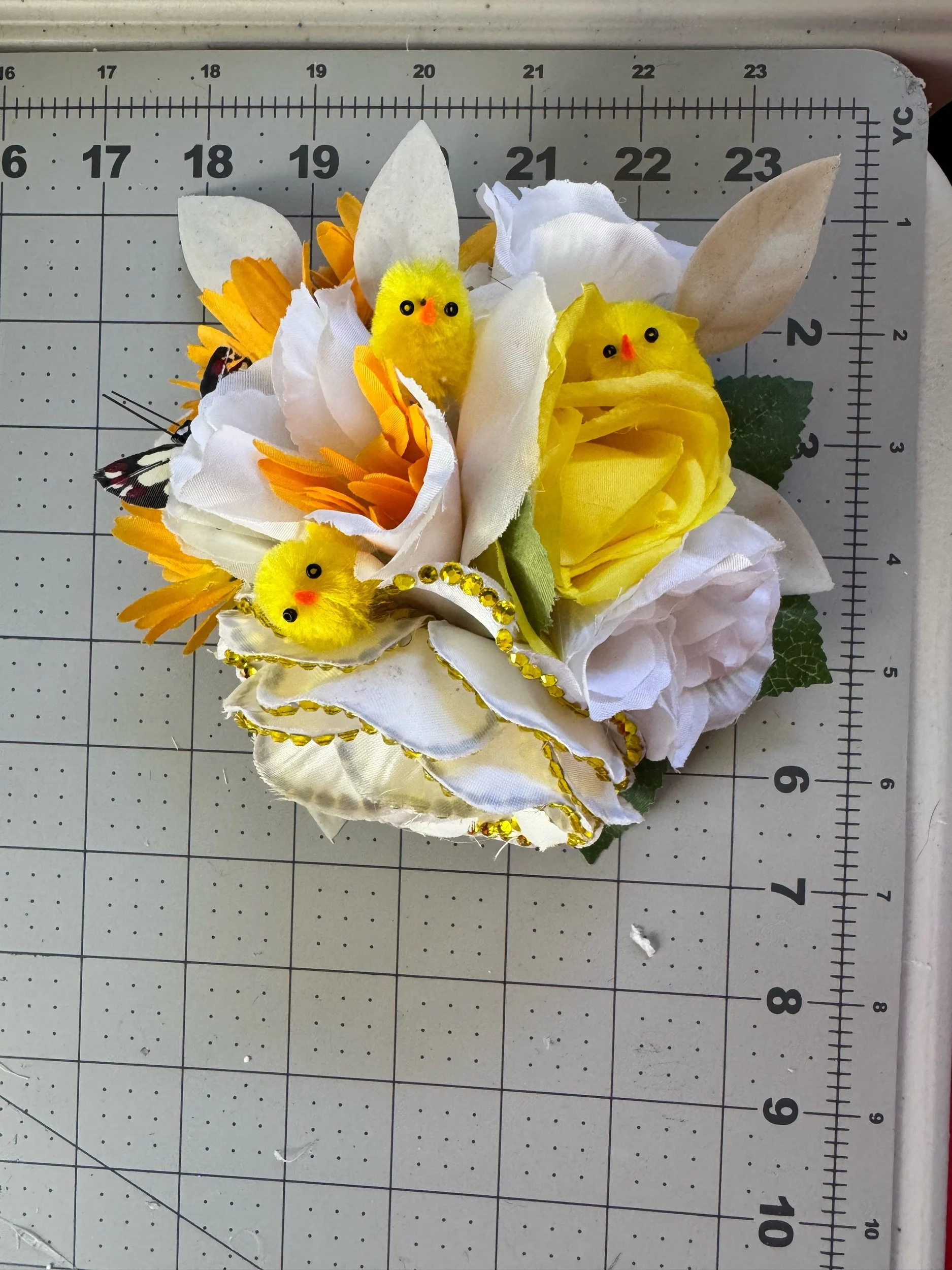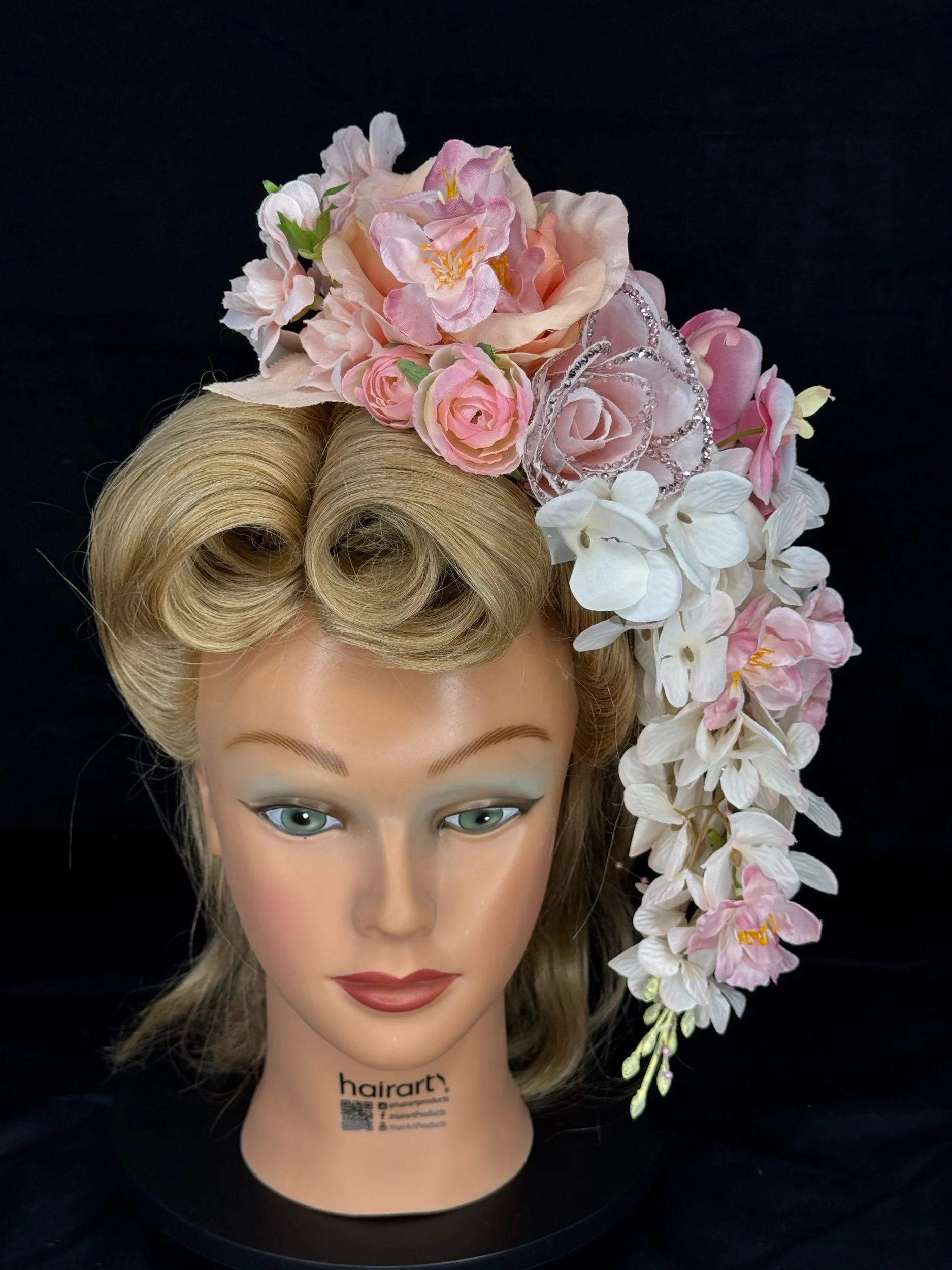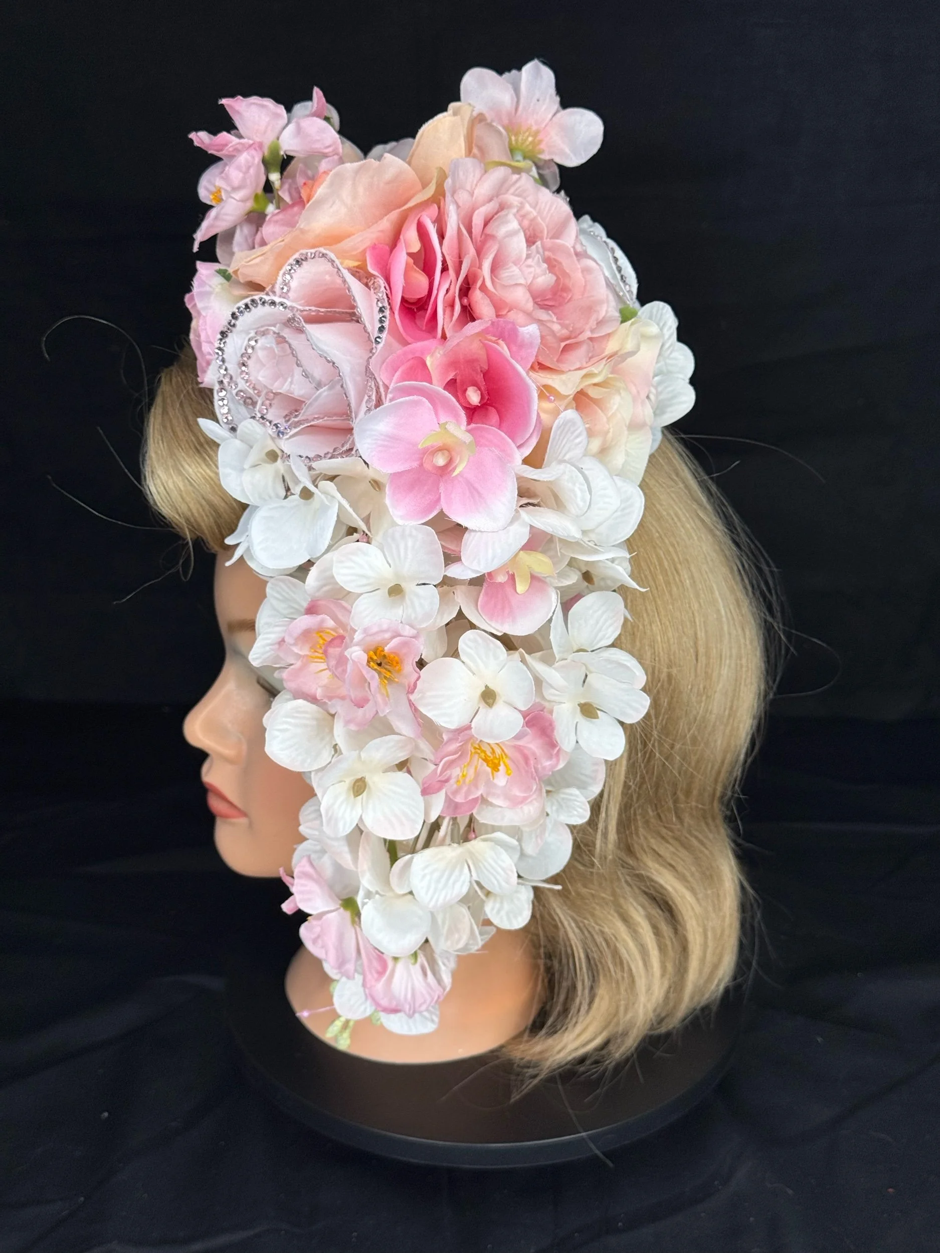 Get ready to be the queen of the garden with “What’s the BUZZ,” a vibrant, mixed-media hairpiece that celebrates the pollinators of spring. This design is an architectural delight, pairing the structural beauty of hand-planed wood flowers with soft, romantic silks and playful, whimsical accents.