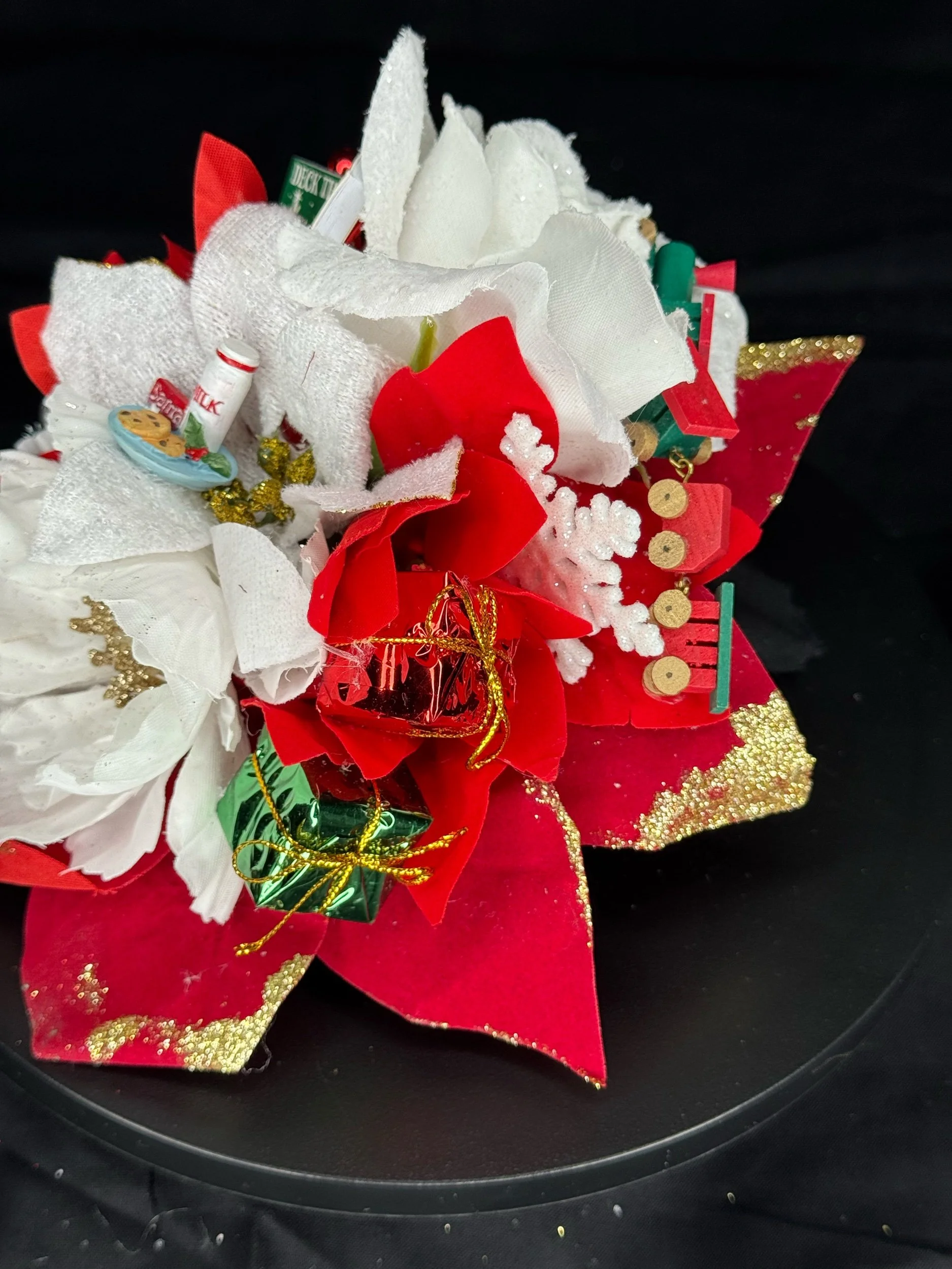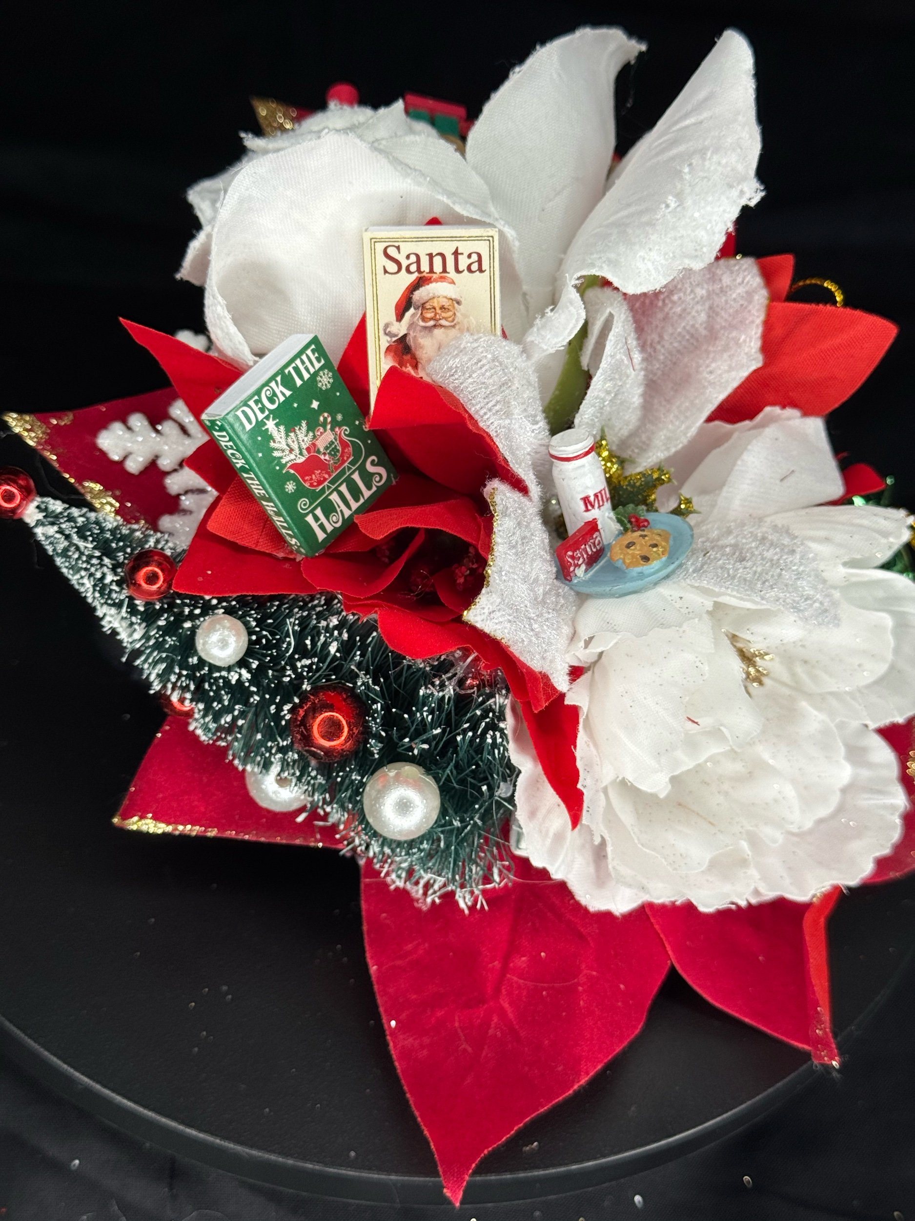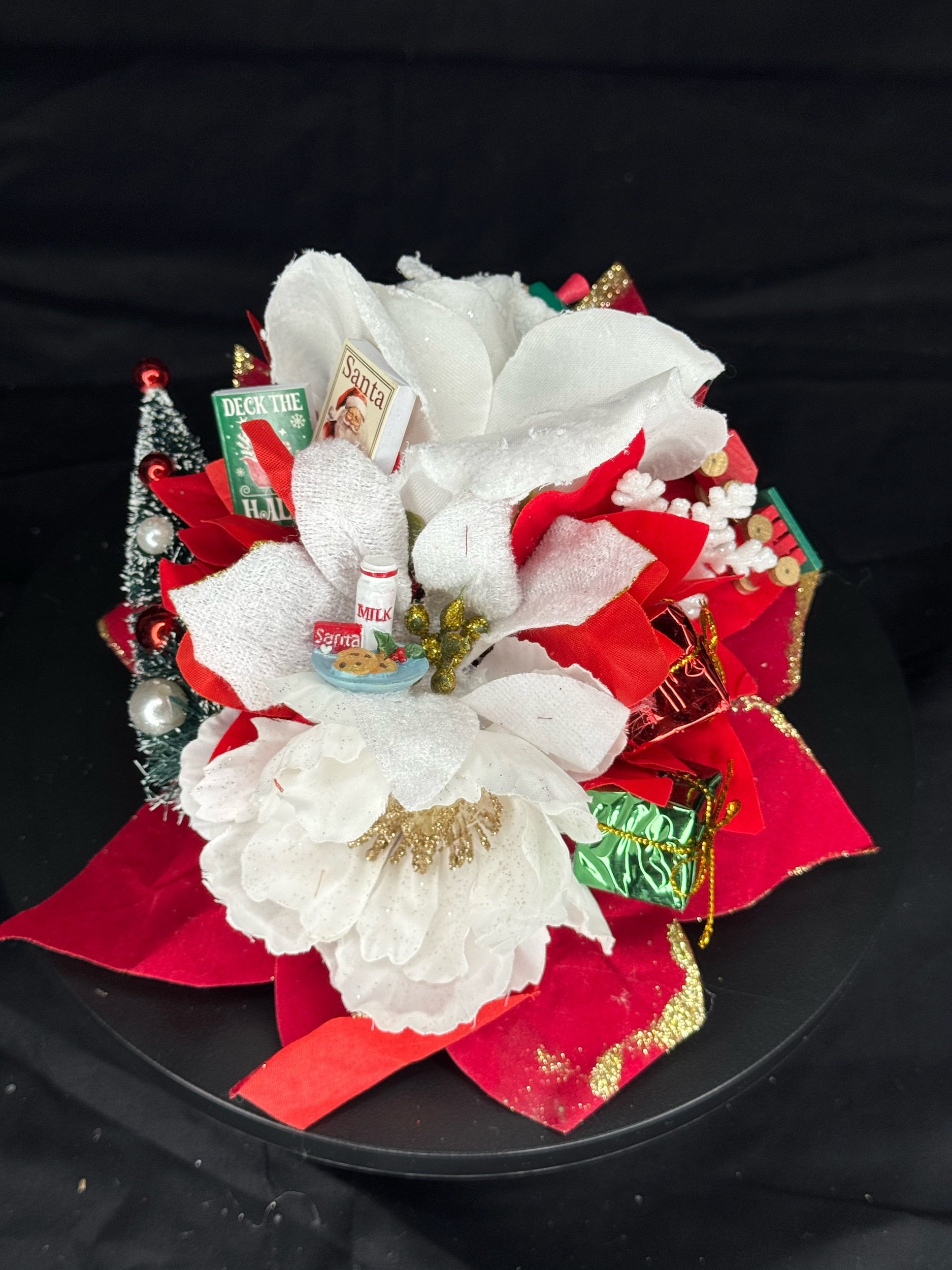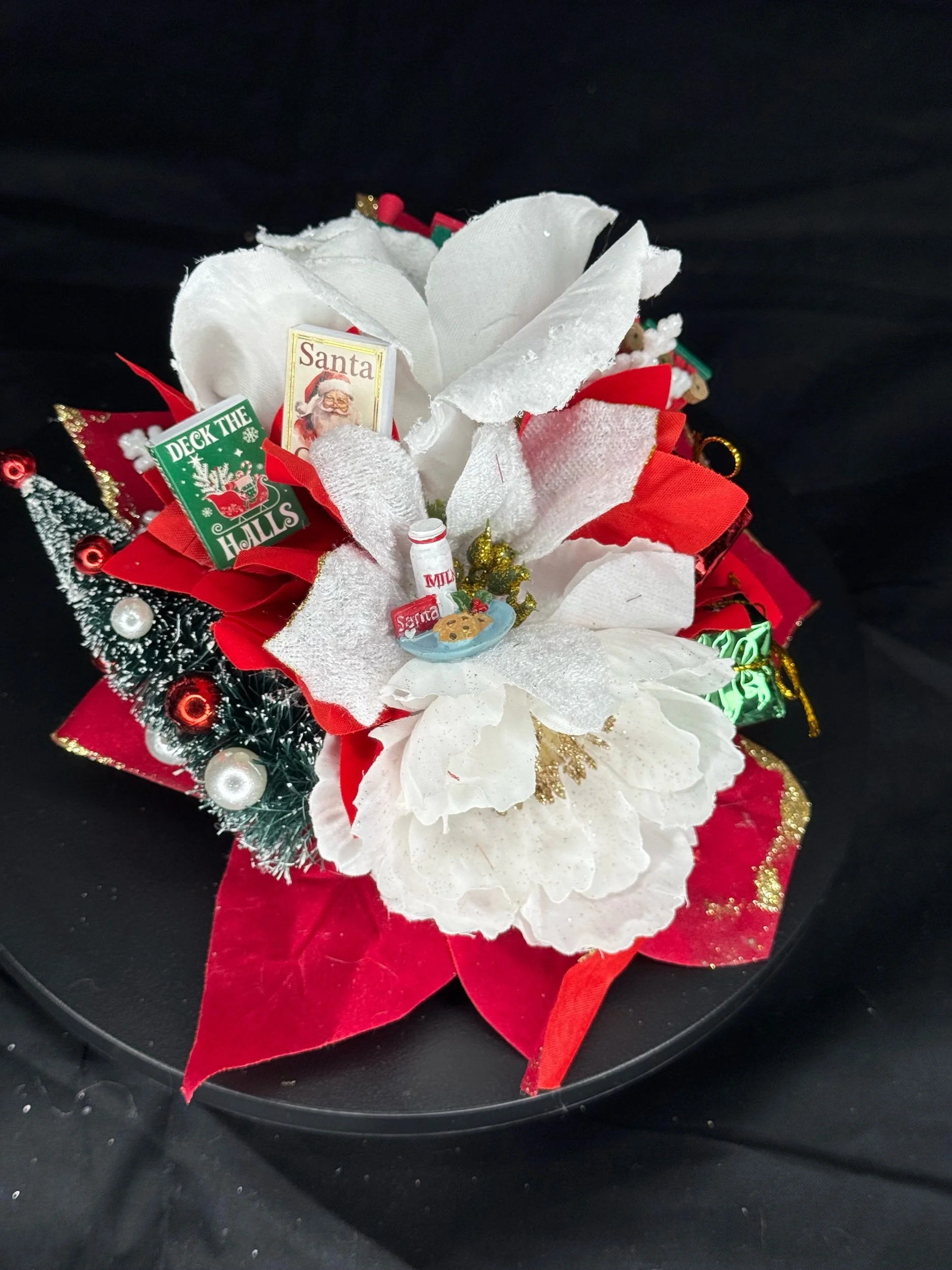 Lovingly handcrafted, Waiting for Santa blooms with layers of velvety red and frosted white poinsettias — classic, festive, and full of vintage spirit. Tucked among the petals is a tiny holiday story brought to life: a miniature Christmas tree adorned with pearls and ornaments, a tray of milk and cookies waiting by the fire, and even a tiny toy train ready to circle the base of Santa’s tree.