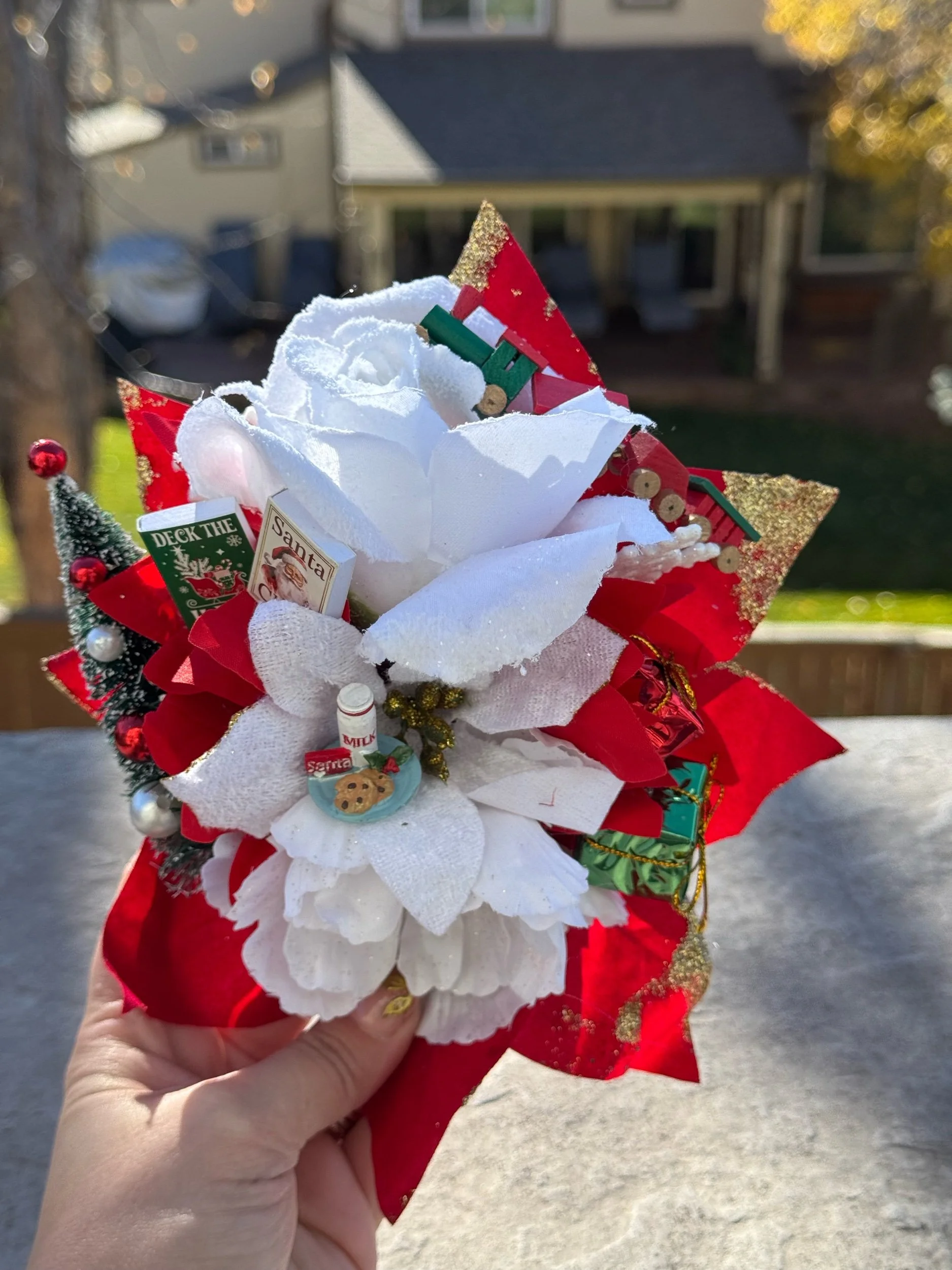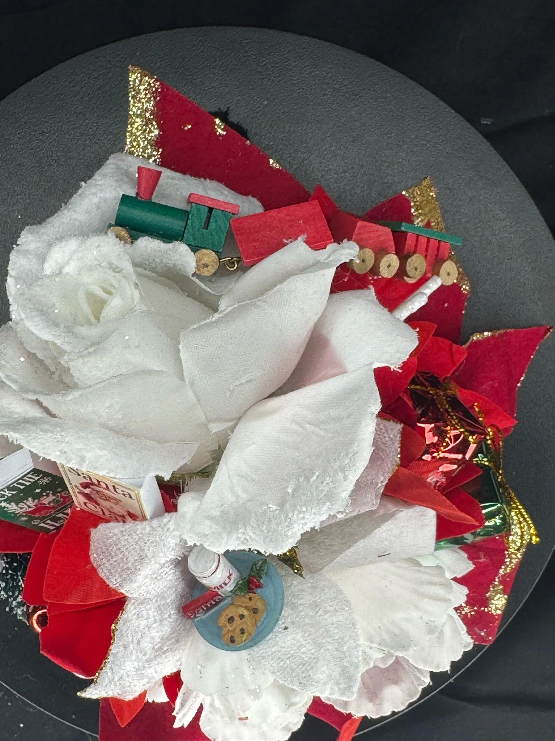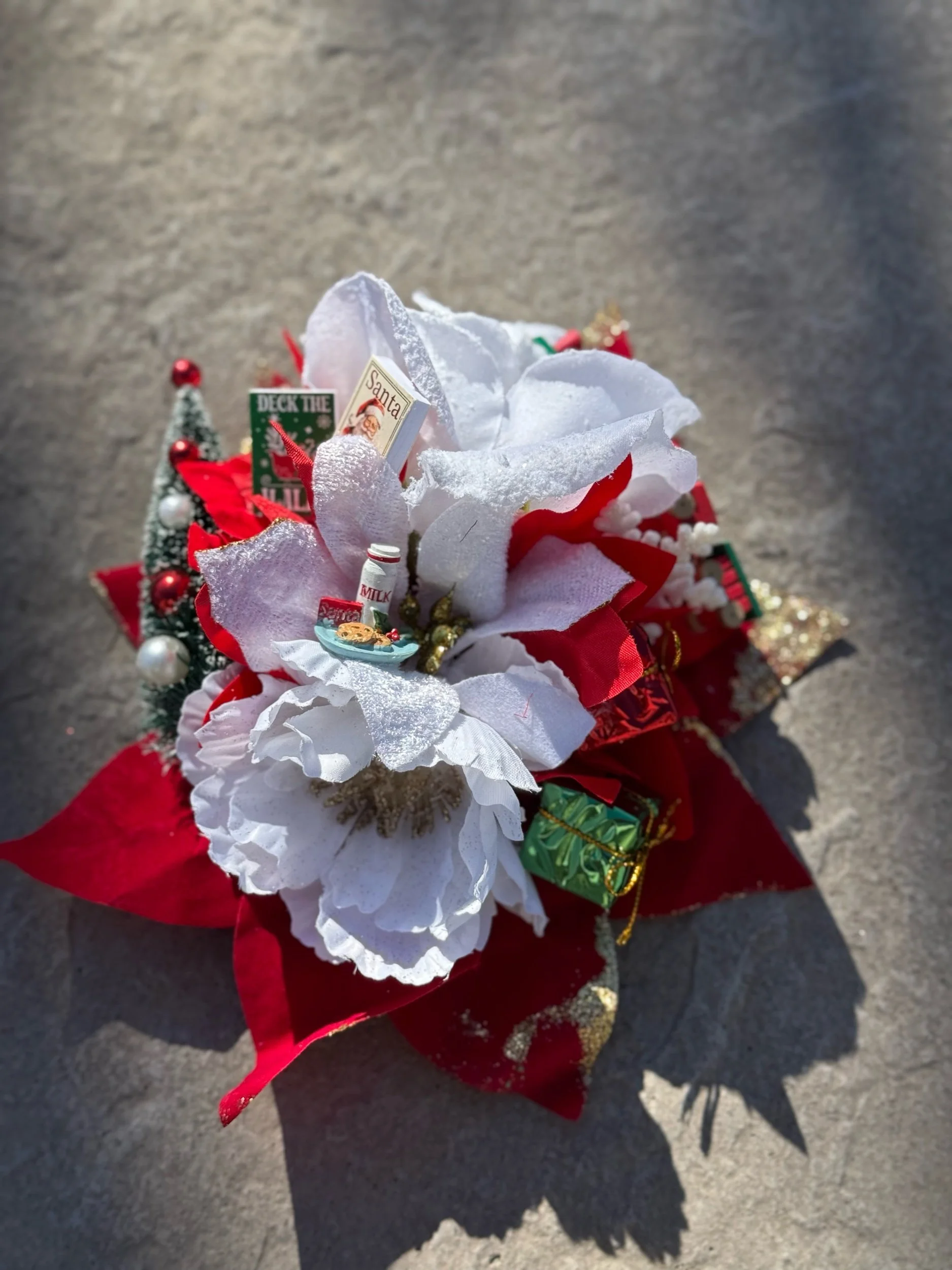 Lovingly handcrafted, Waiting for Santa blooms with layers of velvety red and frosted white poinsettias — classic, festive, and full of vintage spirit. Tucked among the petals is a tiny holiday story brought to life: a miniature Christmas tree adorned with pearls and ornaments, a tray of milk and cookies waiting by the fire, and even a tiny toy train ready to circle the base of Santa’s tree.