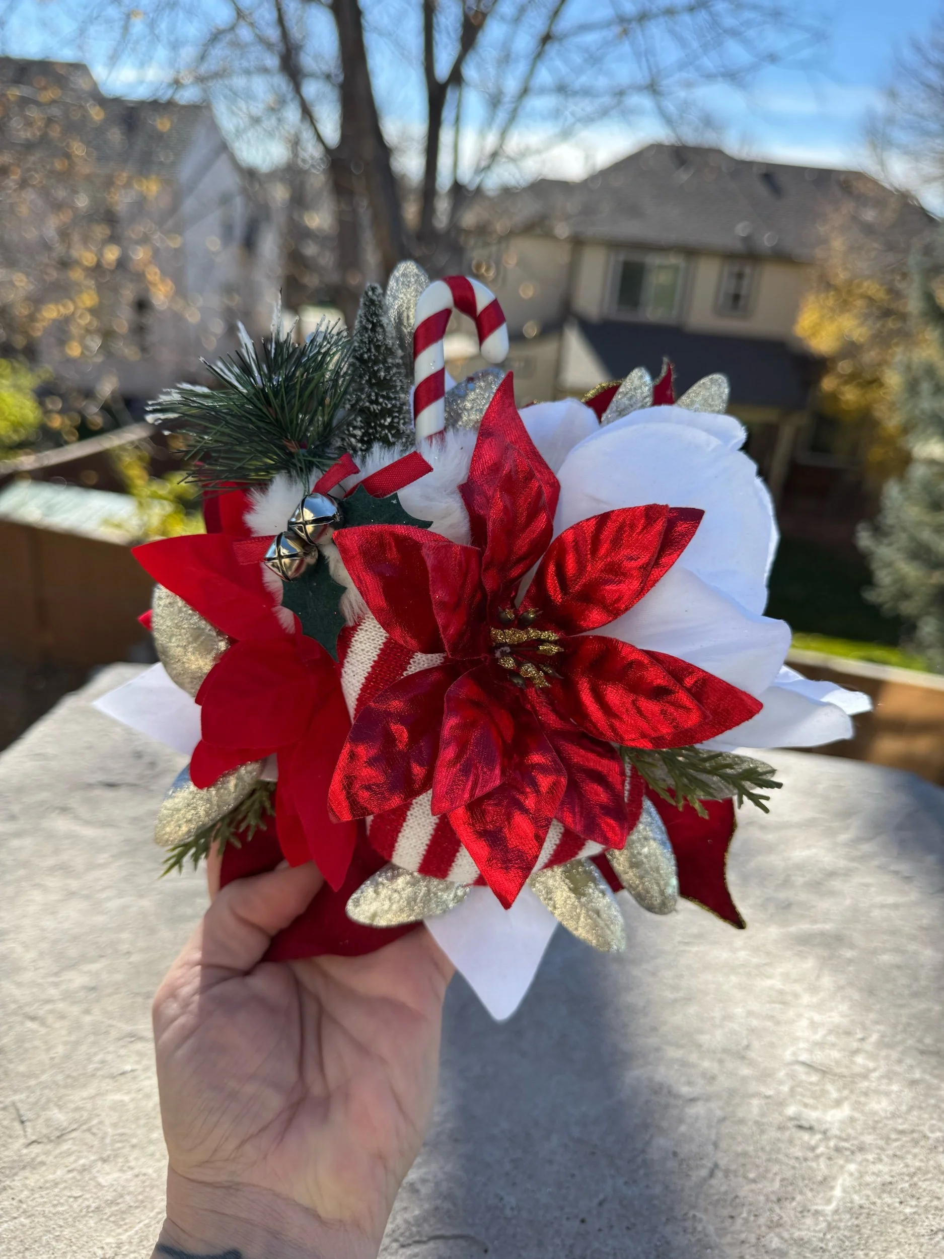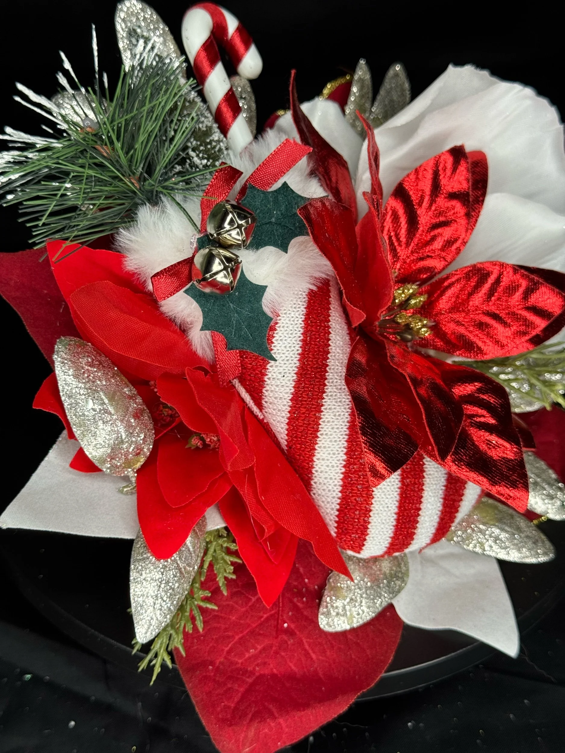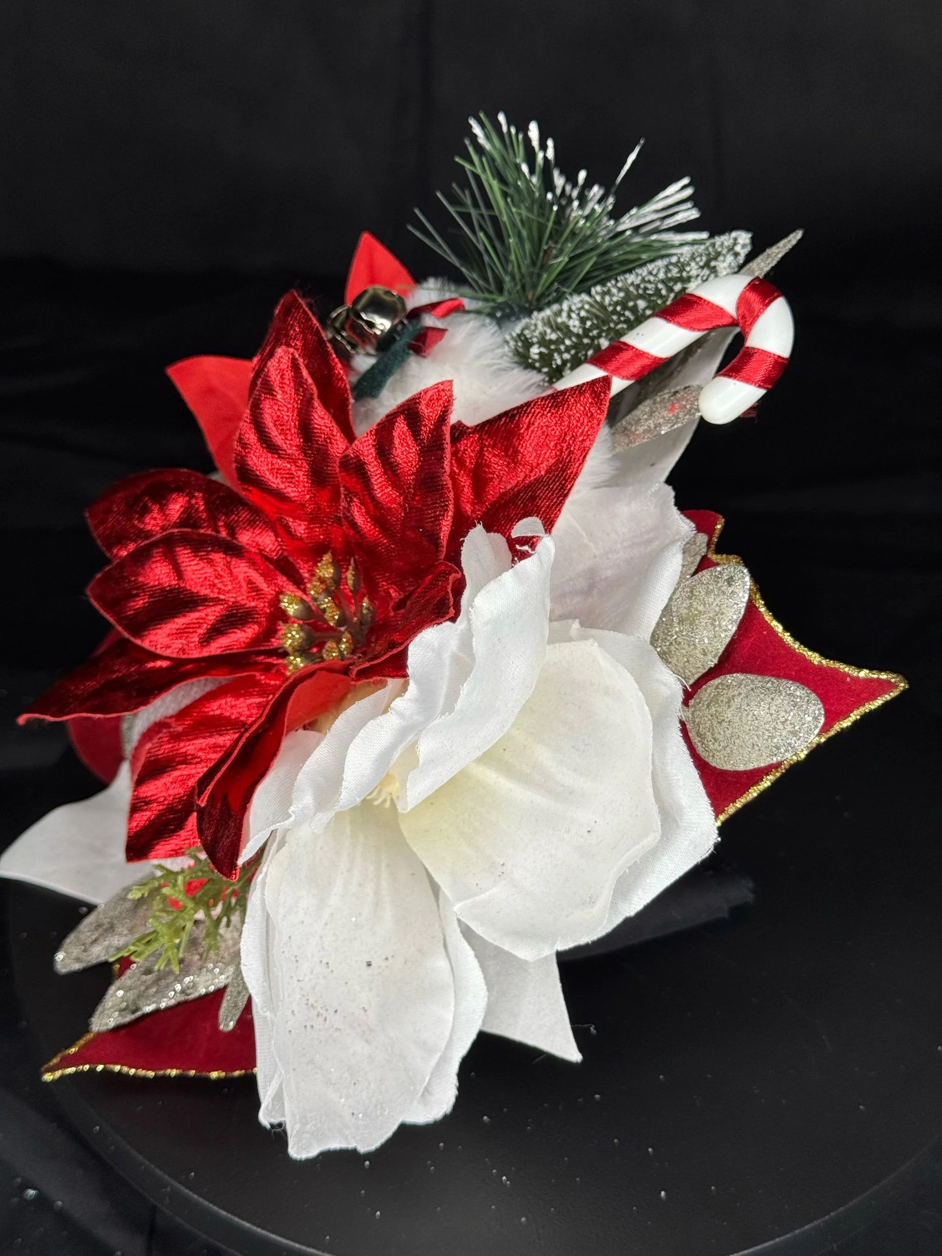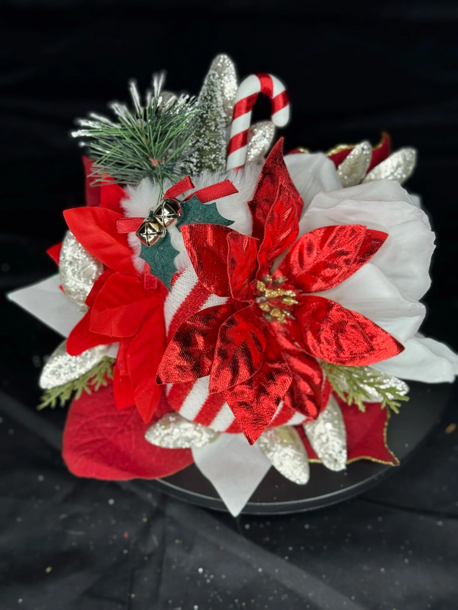 Lovingly handcrafted, Waiting for Santa blooms with layers of velvety red and frosted white poinsettias — classic, festive, and full of vintage spirit. Tucked among the petals is a tiny holiday story brought to life: a miniature Christmas tree adorned with pearls and ornaments, a tray of milk and cookies waiting by the fire, and even a tiny toy train ready to circle the base of Santa’s tree.