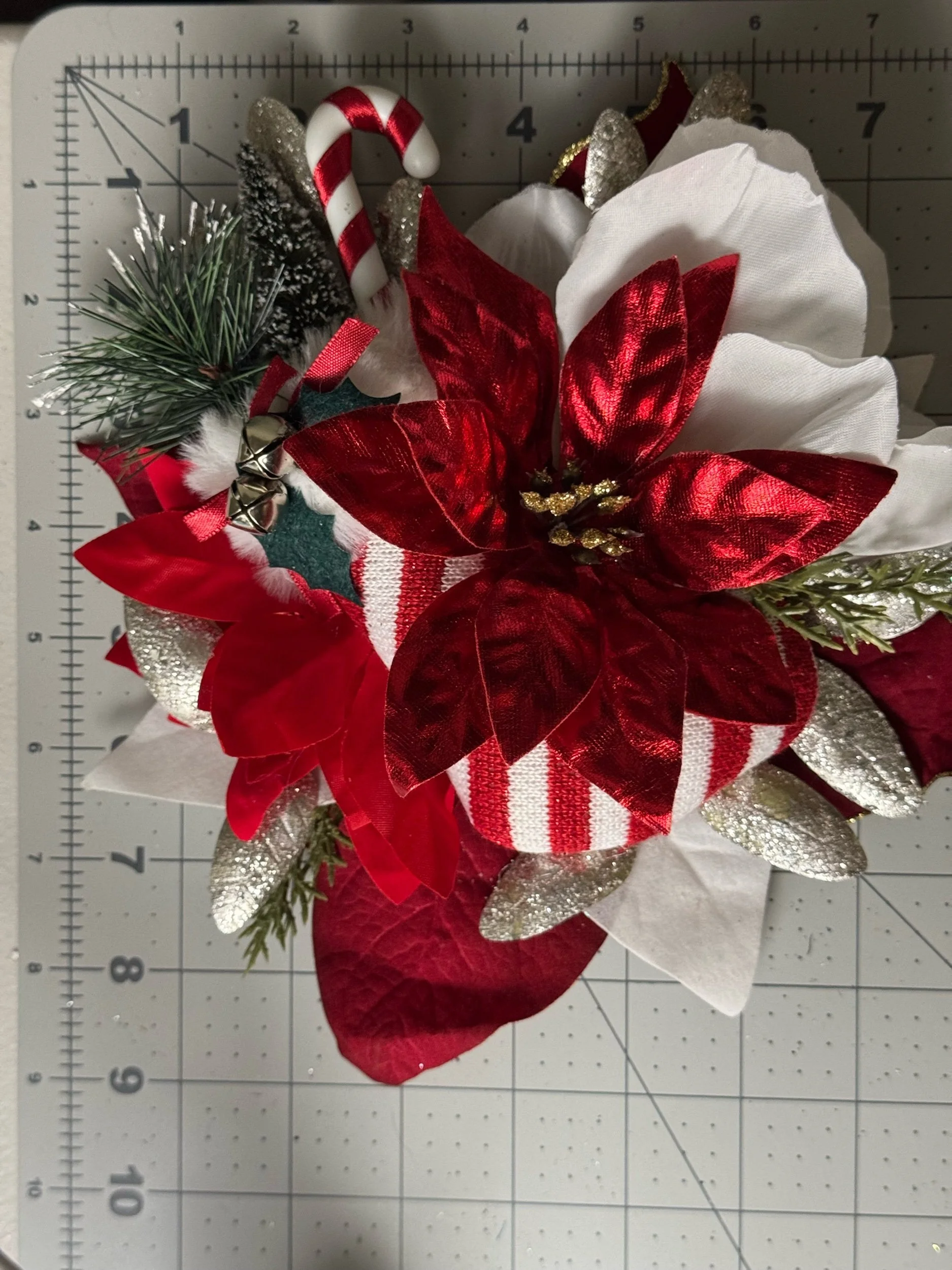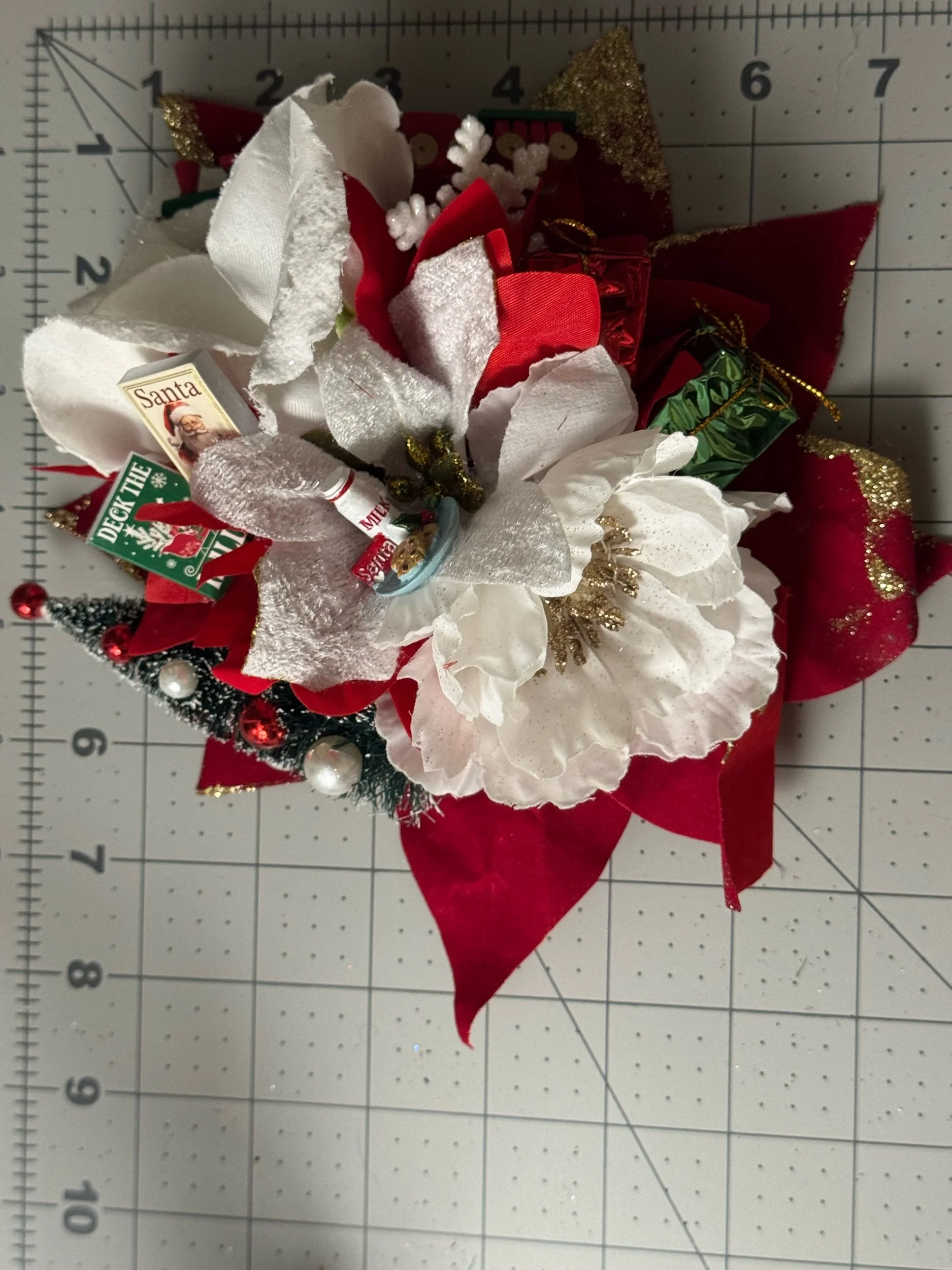 Nestled between the blooms are vintage-inspired details like a “Deck the Halls” book, old-fashioned Santa card, and glimmers of gold and red accents reminiscent of mid-century tinsel décor. Each element is placed with care to create a perfect balance of whimsy and elegance — a wearable keepsake of Christmas Eve magic.