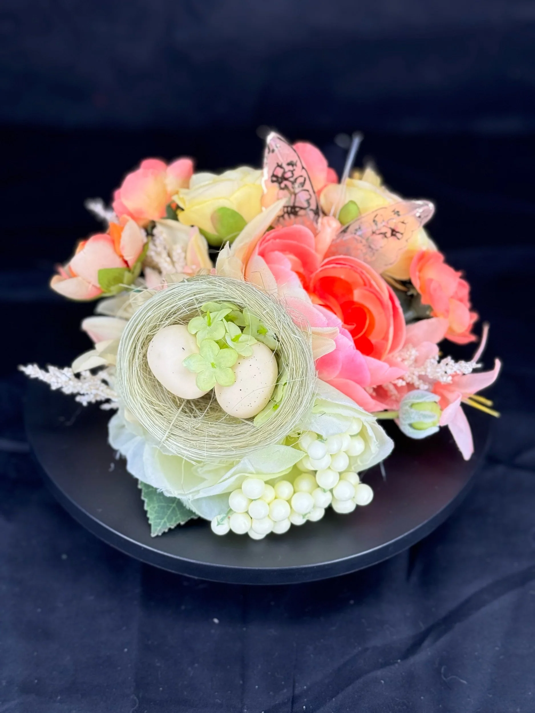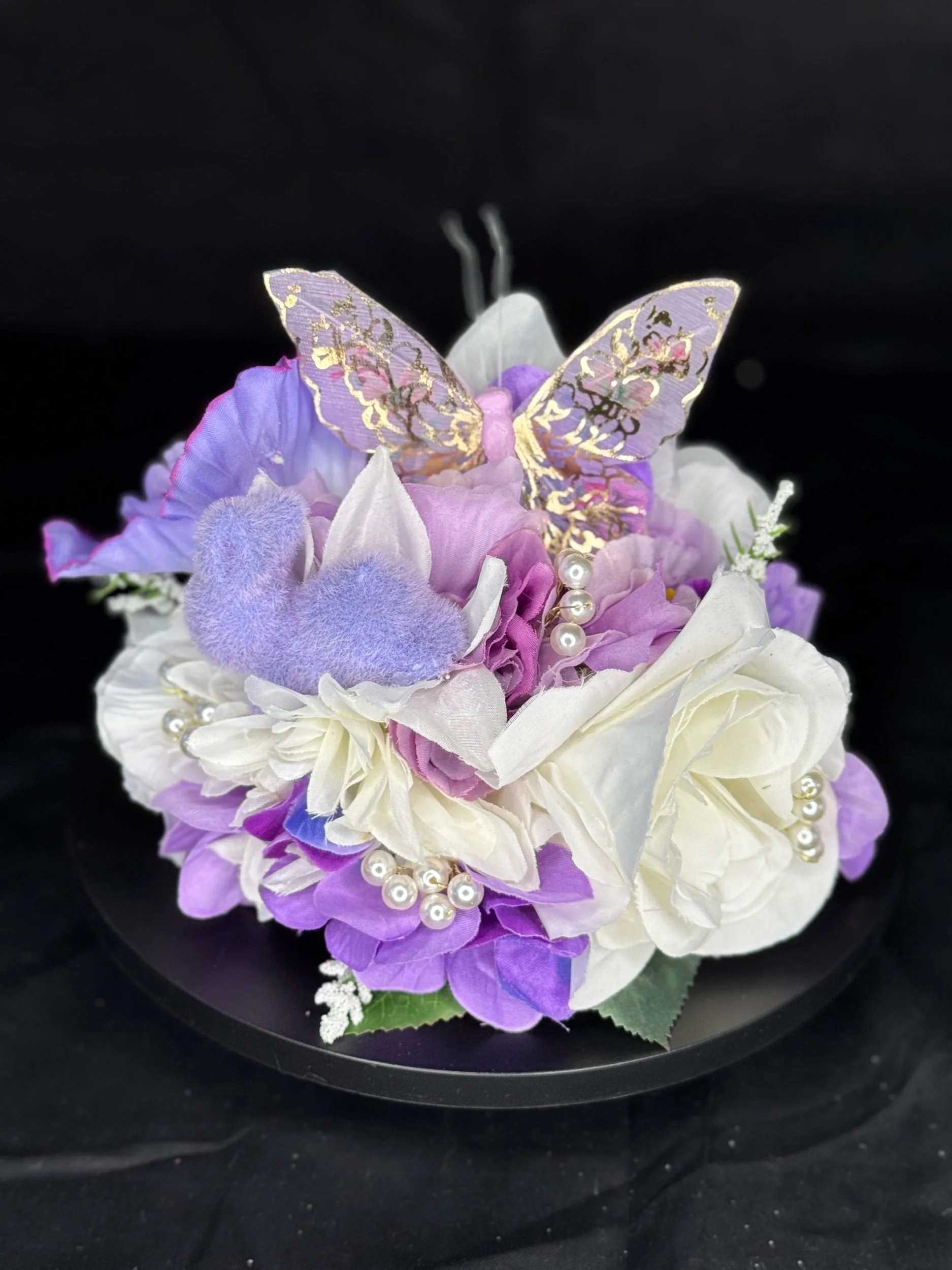 • The "Foo Foo" Bunny: At the center of this floral paradise sits a plush, velvety lavender bunny, adding a soft, tactile element that is both sweet and unique.