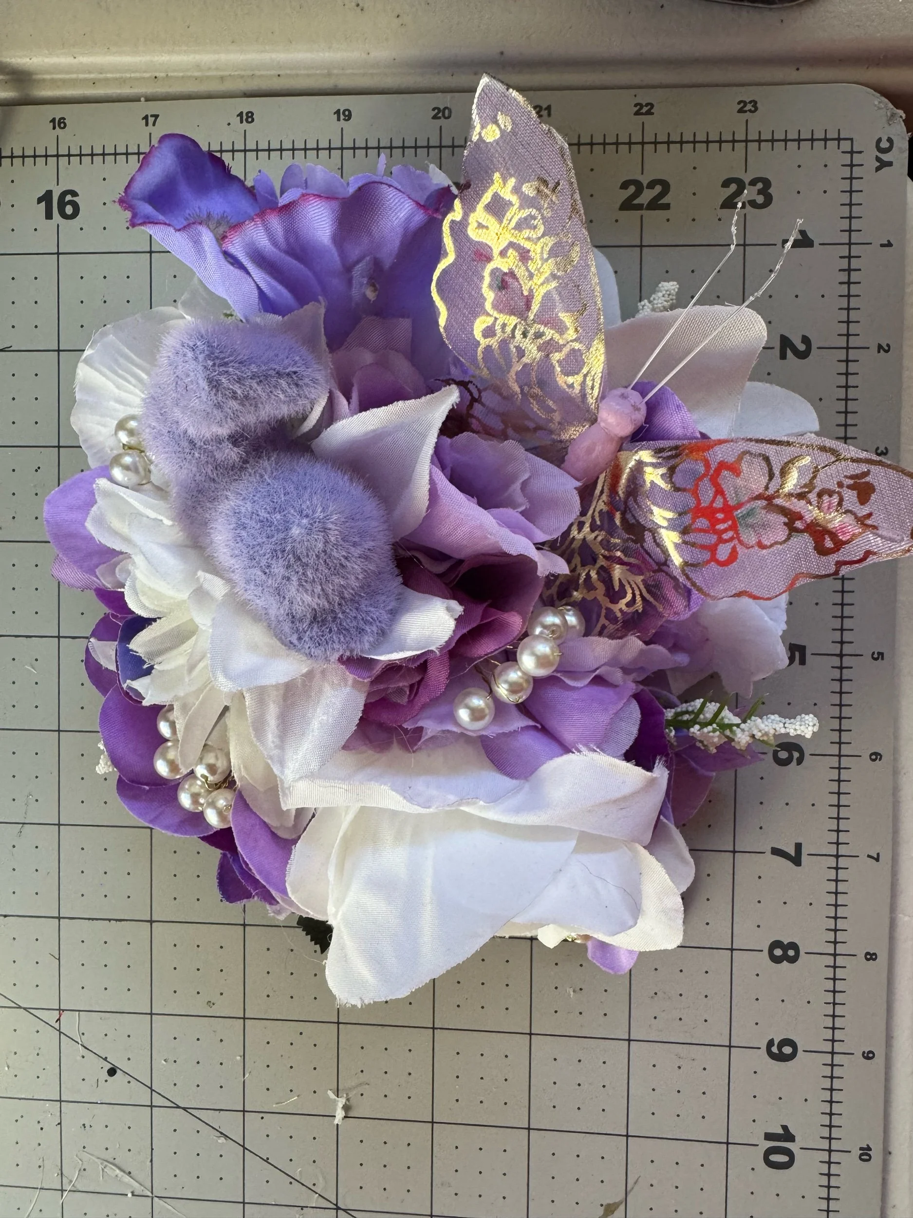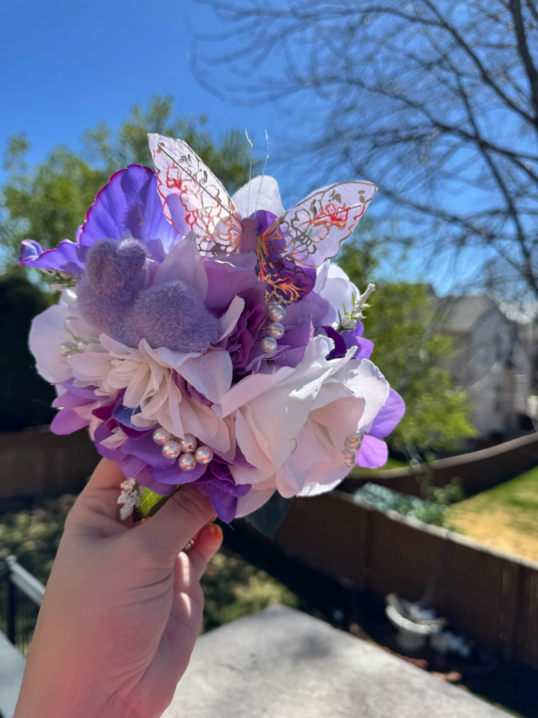 • The Golden Butterfly: A magnificent lavender butterfly with intricate gold-foiled patterns on its wings rests atop the bouquet, adding a touch of shimmer and movement.