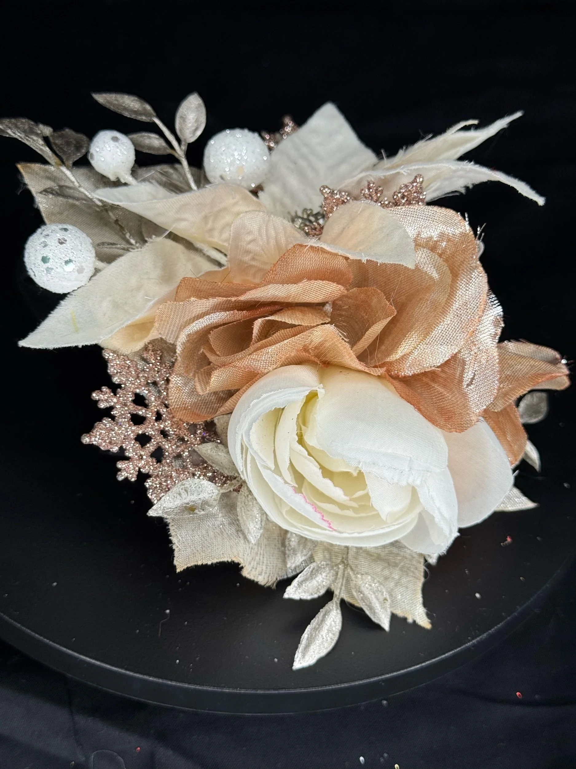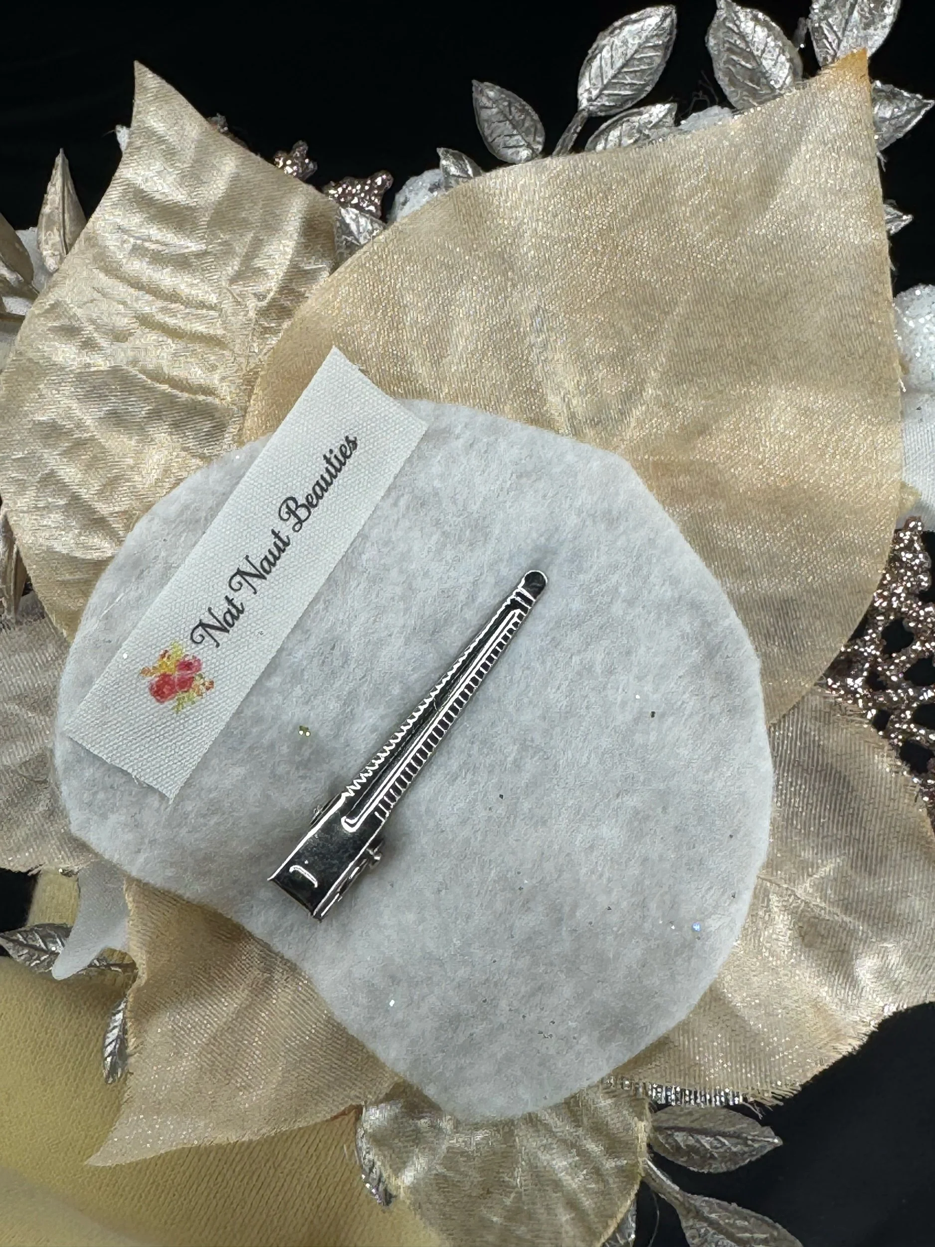 The coordinating Nat Naut Beauties original hair flower is a festive showstopper — a lush, glitter-kissed cluster of frosted white hydrangeas, red poinsettias, and shimmering green leaves. Hints of holly texture and soft sparkle mimic freshly fallen snow, while the arrangement’s balance of classic holiday hues makes it versatile for any pin-up or vintage-inspired look.