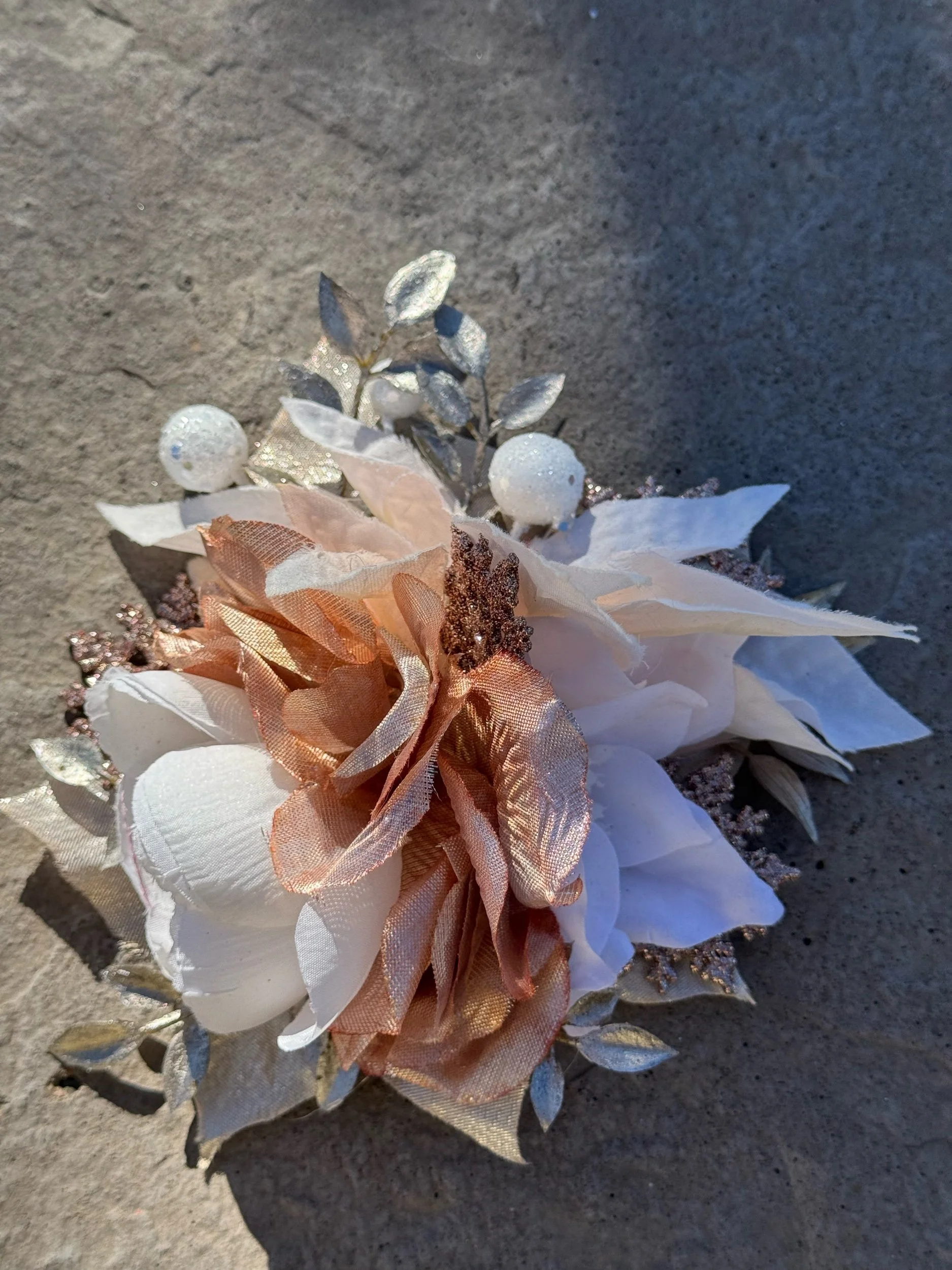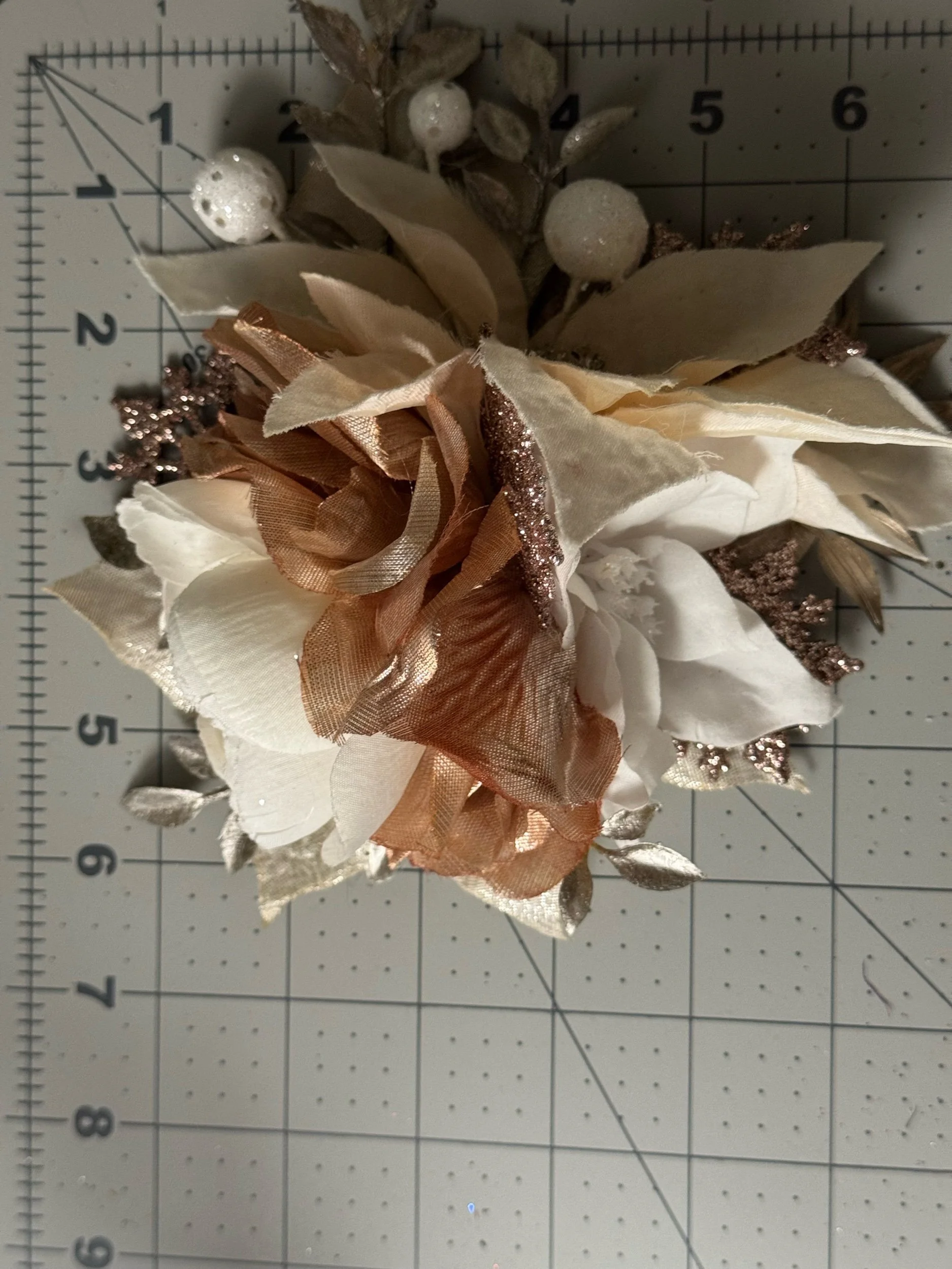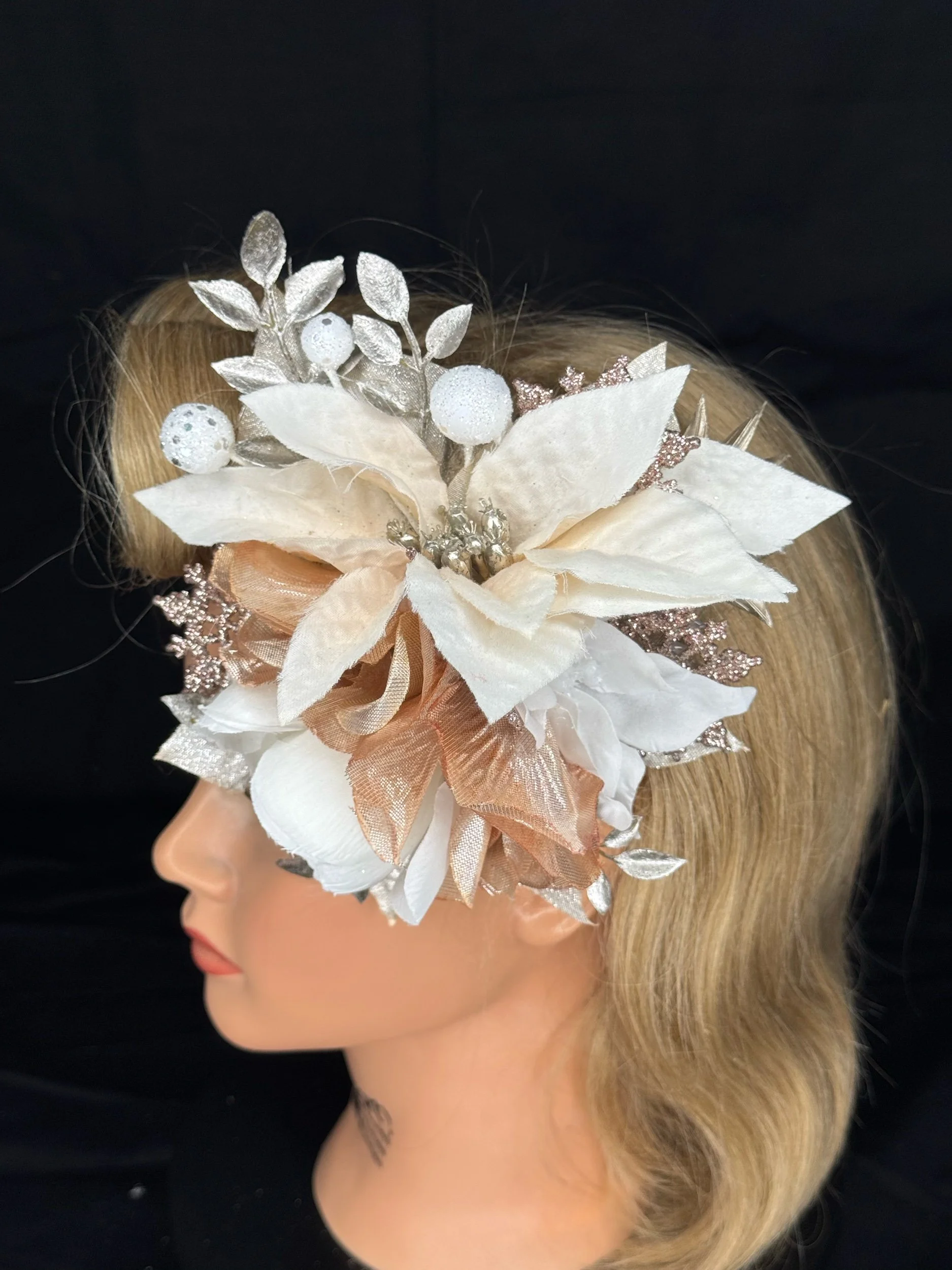 Hairpiece features frosted florals, glittered greens, and poinsettia accents