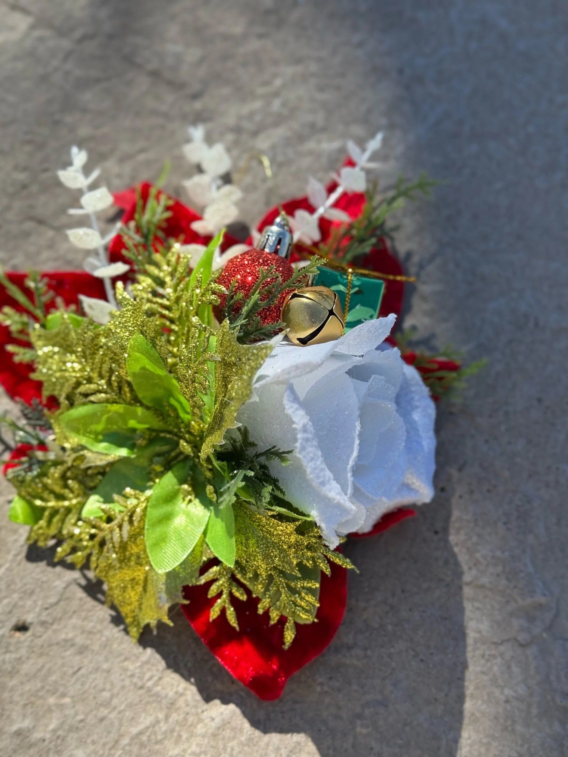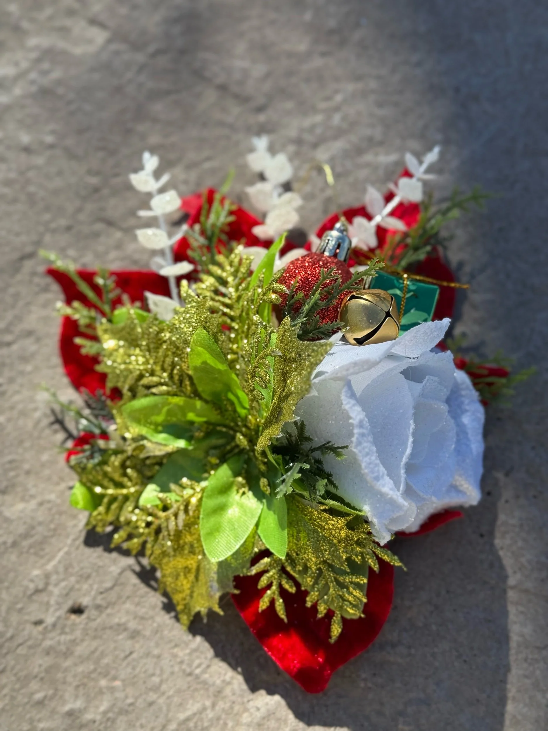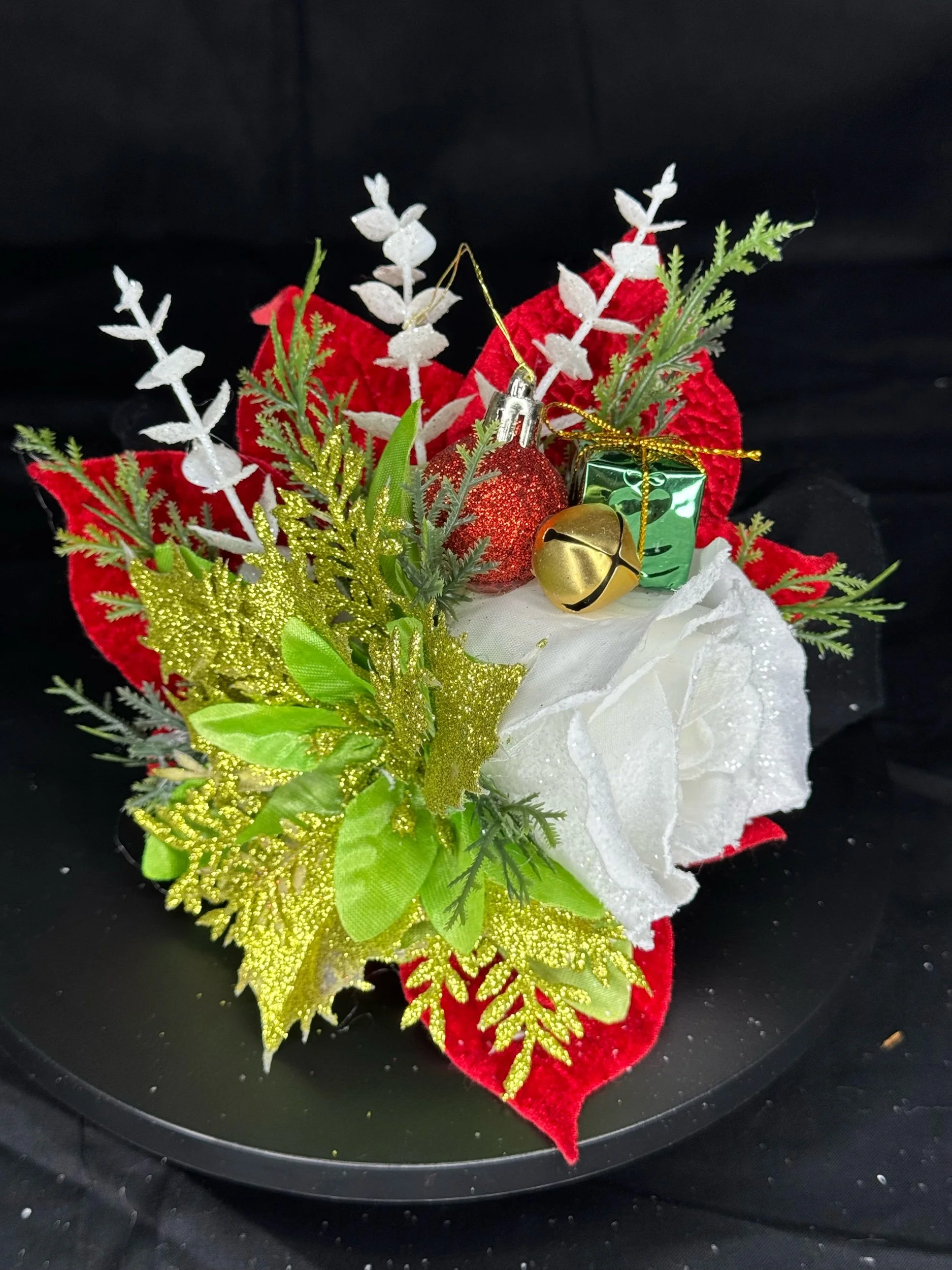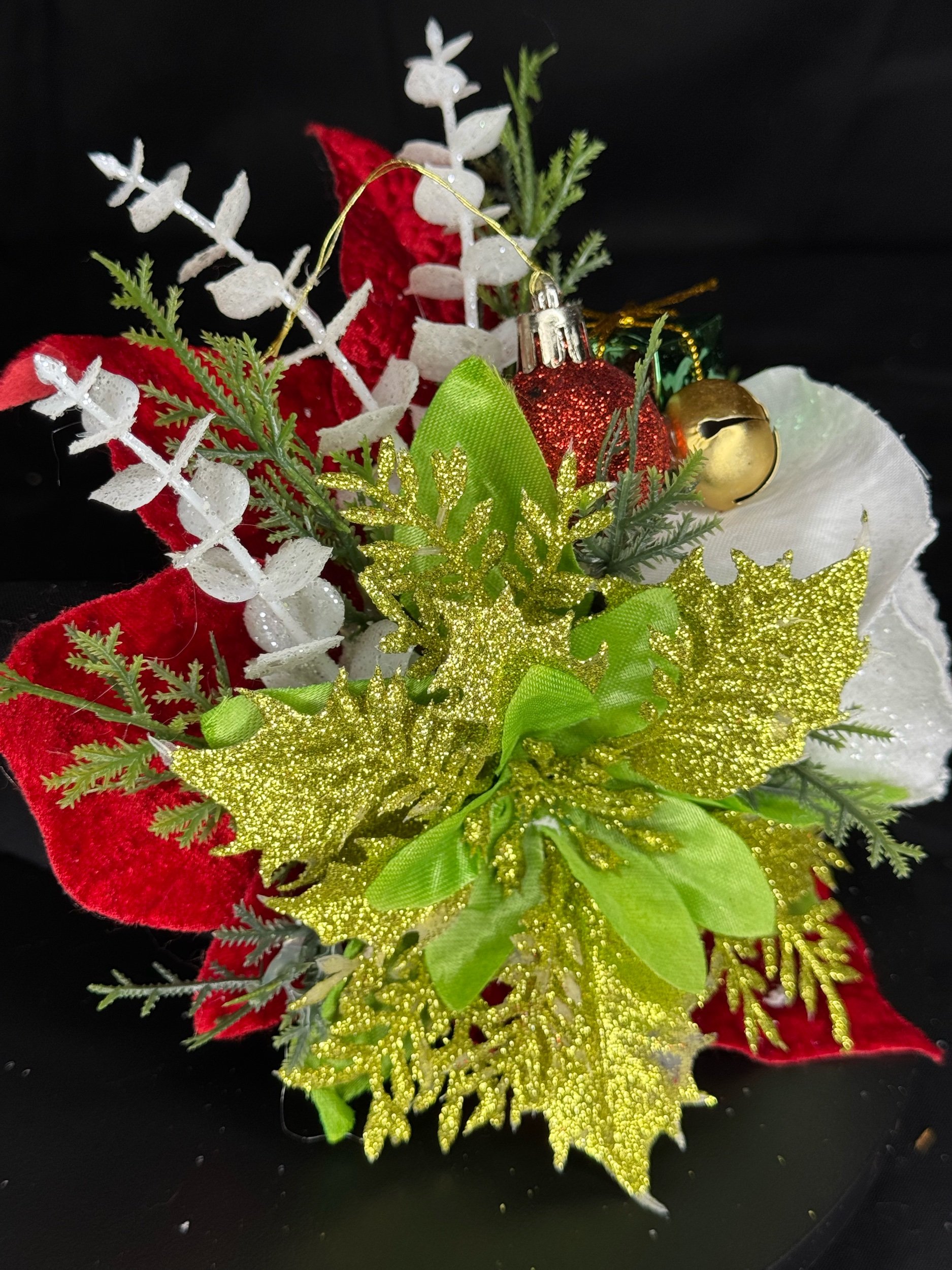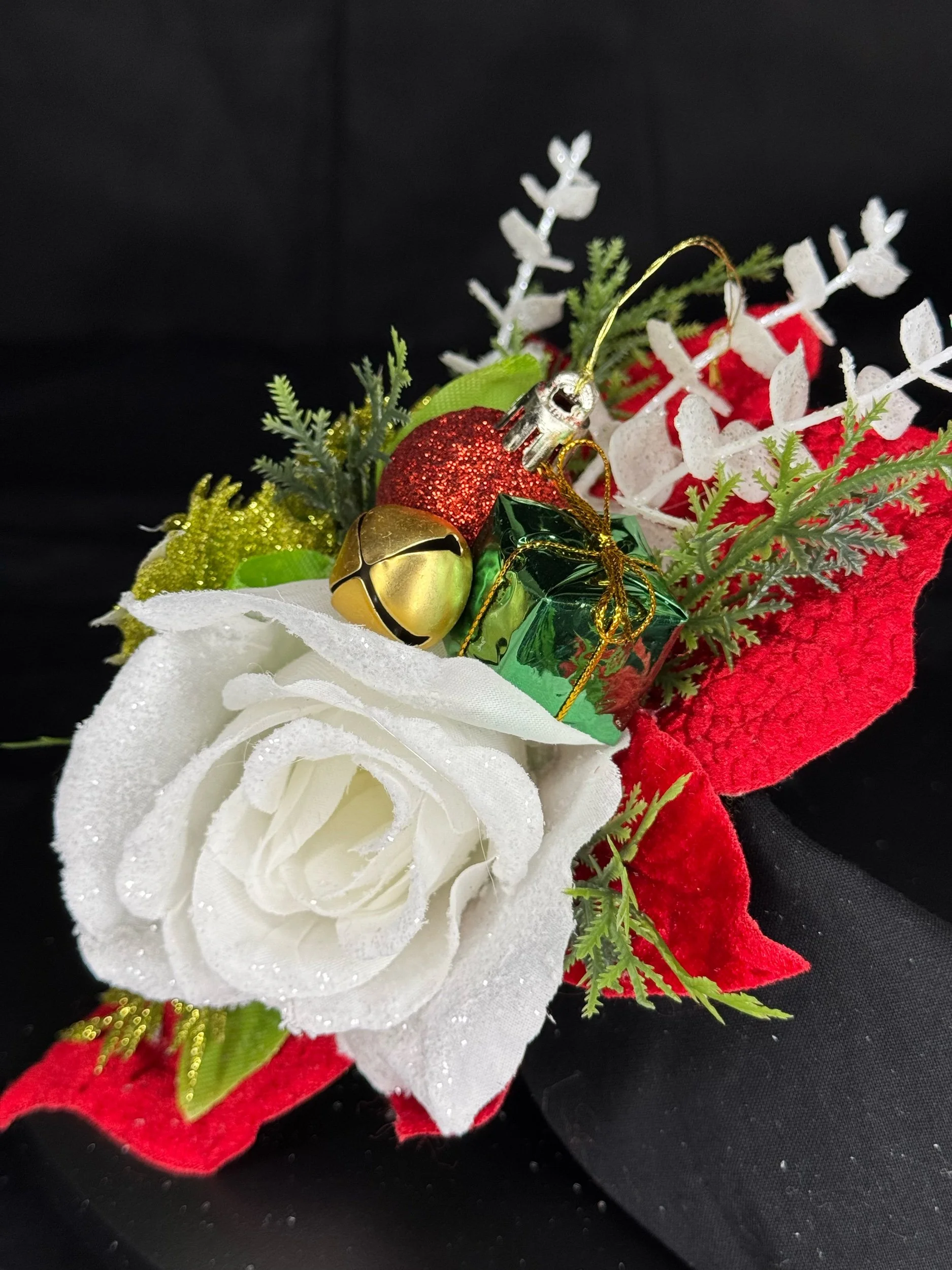 Hand-crafted with layers of velvety red poinsettias and frosted white blooms, Holiday Cheer-Meister bursts with life and light. Glittering gold leaves, shimmery greenery, and textured evergreen sprigs bring depth and dazzle, while playful touches — a mini gift box, gleaming ornament, and golden jingle bell — add that irresistible retro-holiday charm.
