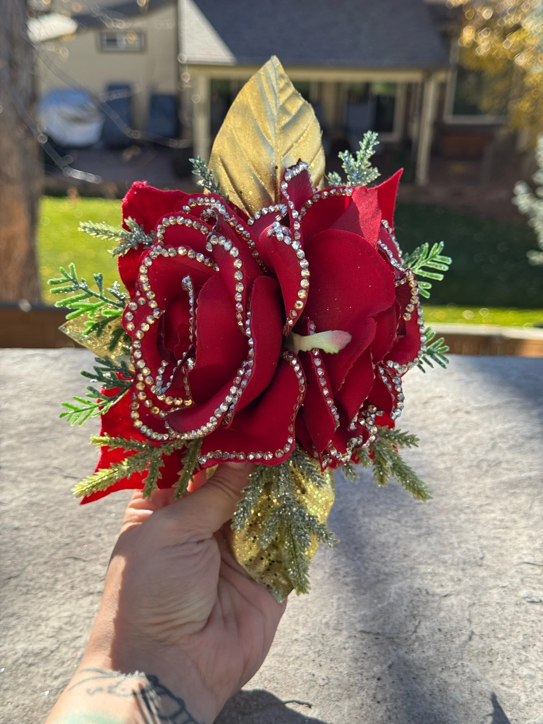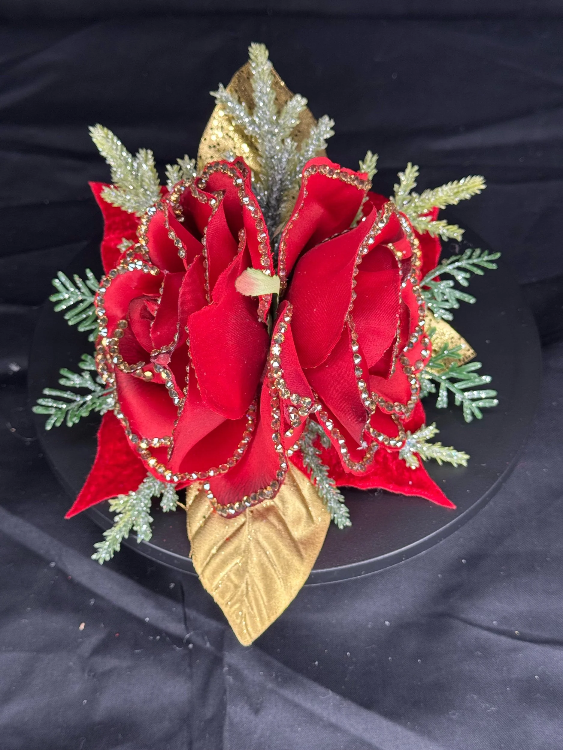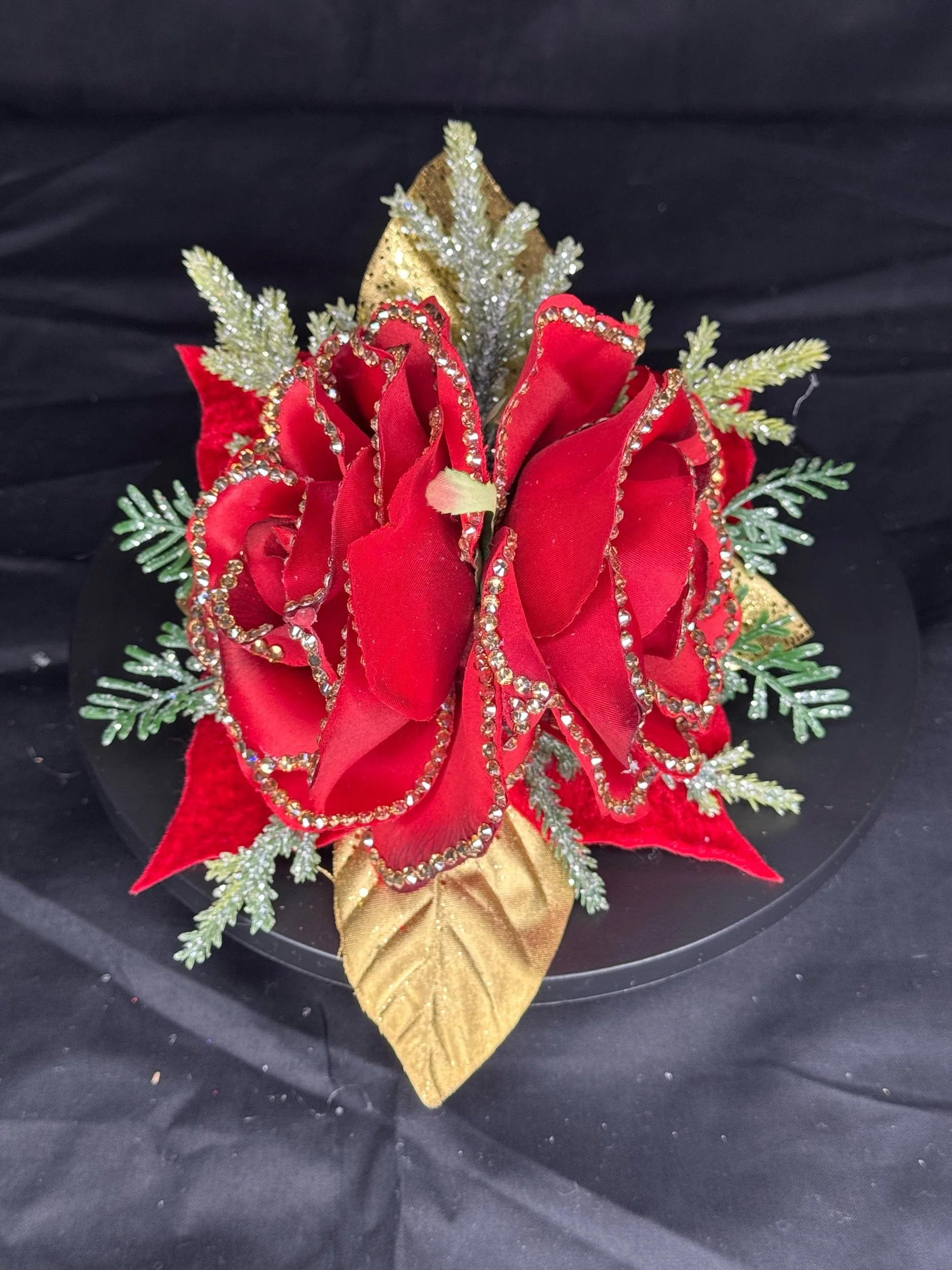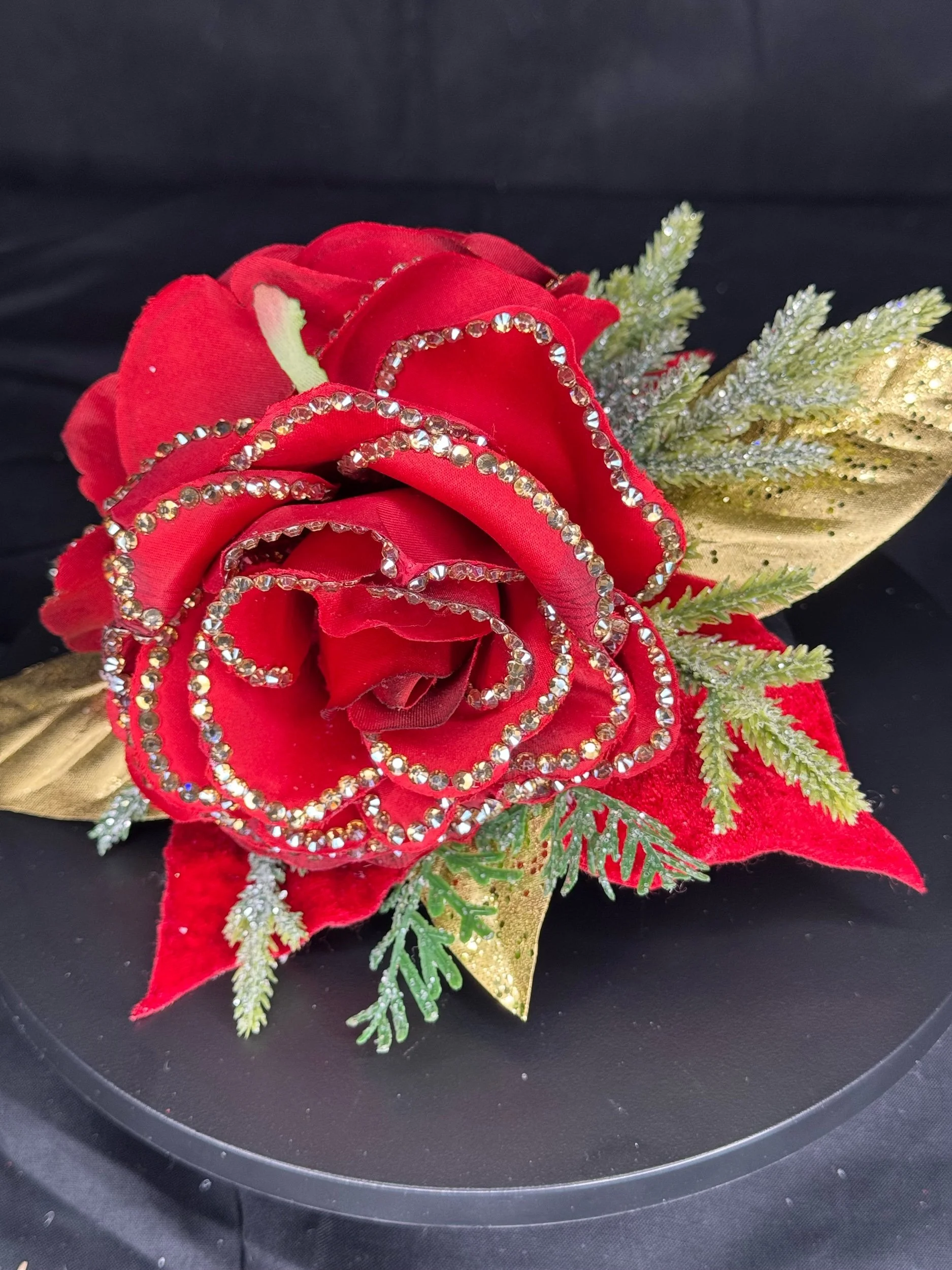 This handmade masterpiece features lush, velvety red roses — each petal meticulously lined with hand-set rhinestones that shimmer like freshly strung Christmas lights. Golden leaves and glittering evergreen sprigs peek through the design, adding layers of warmth and radiance.