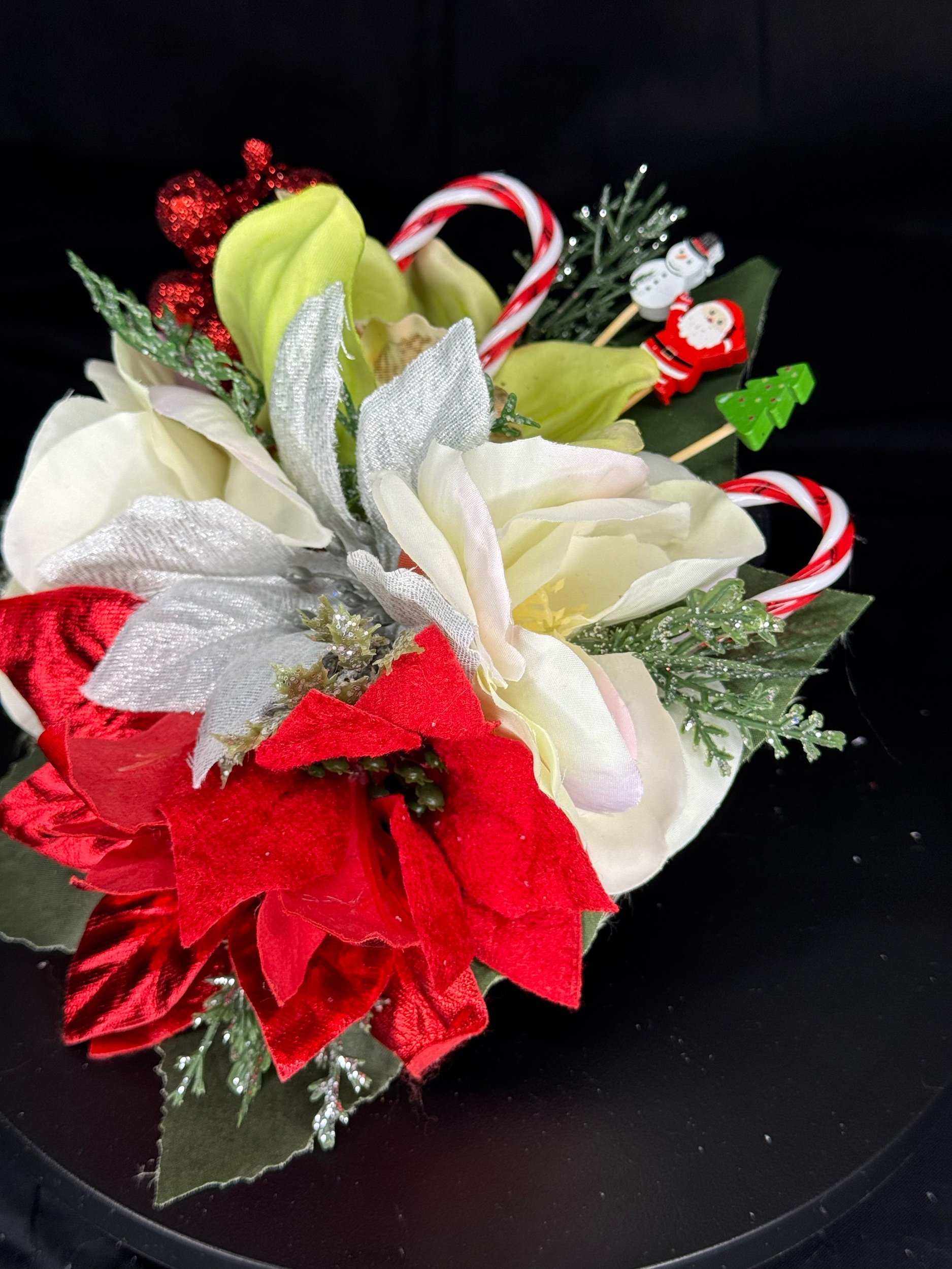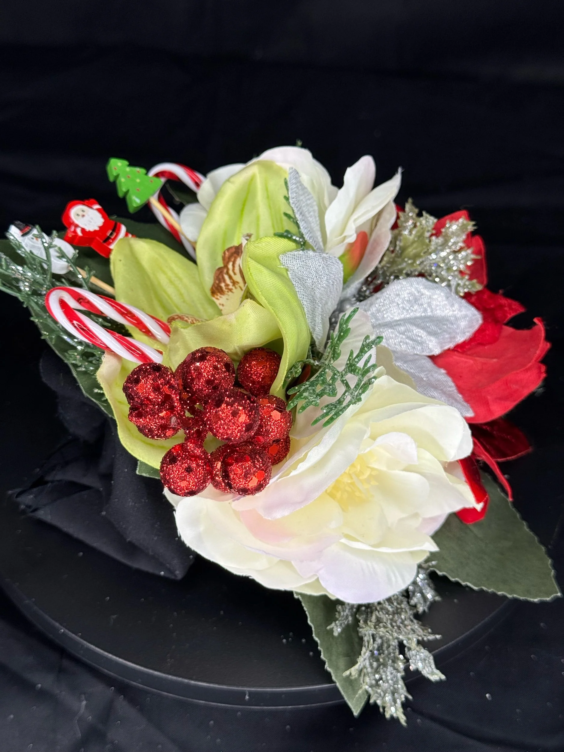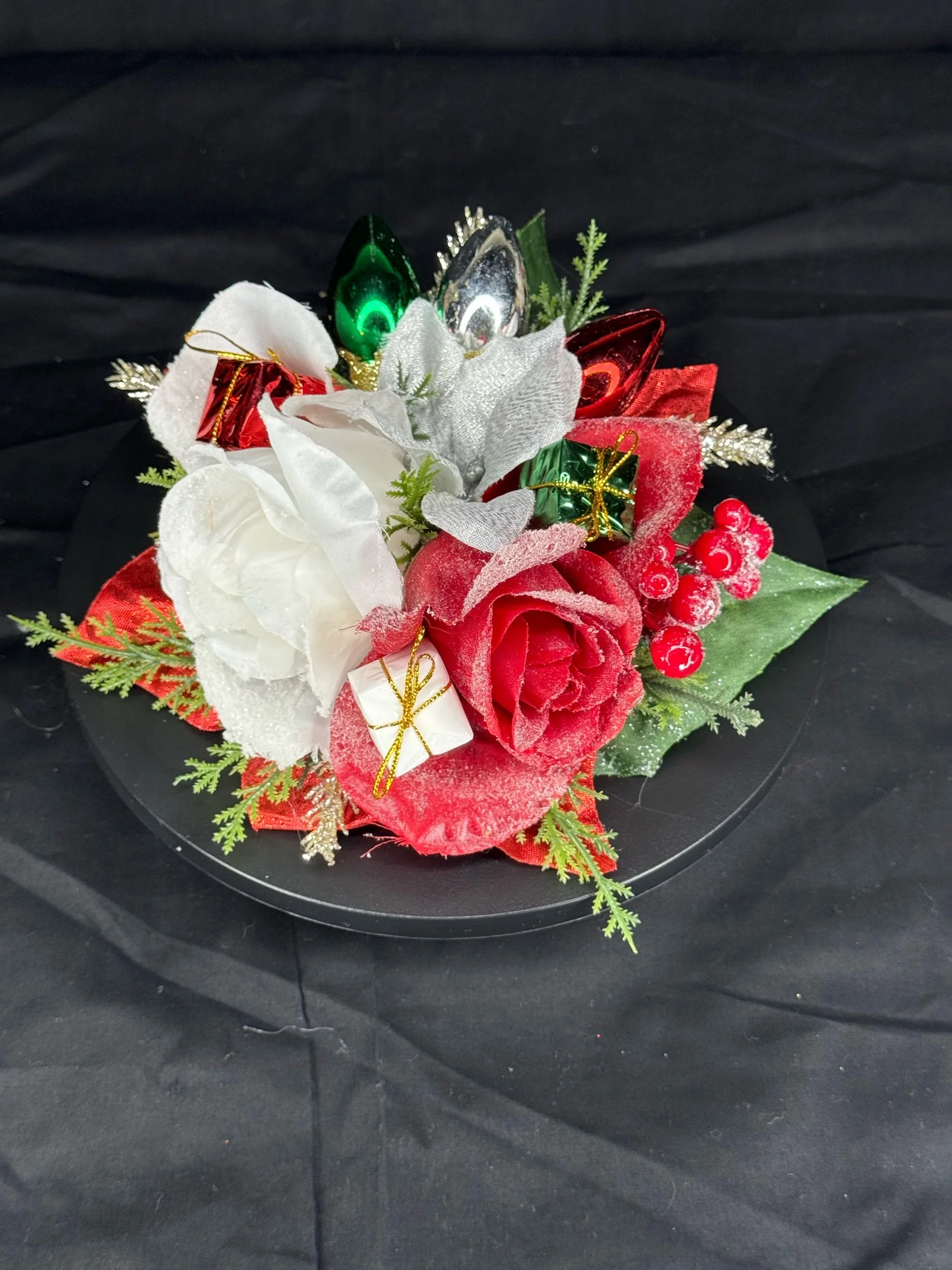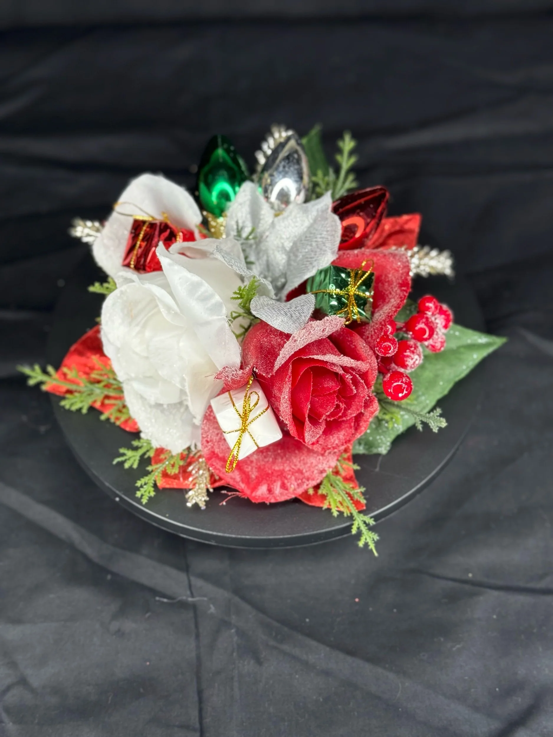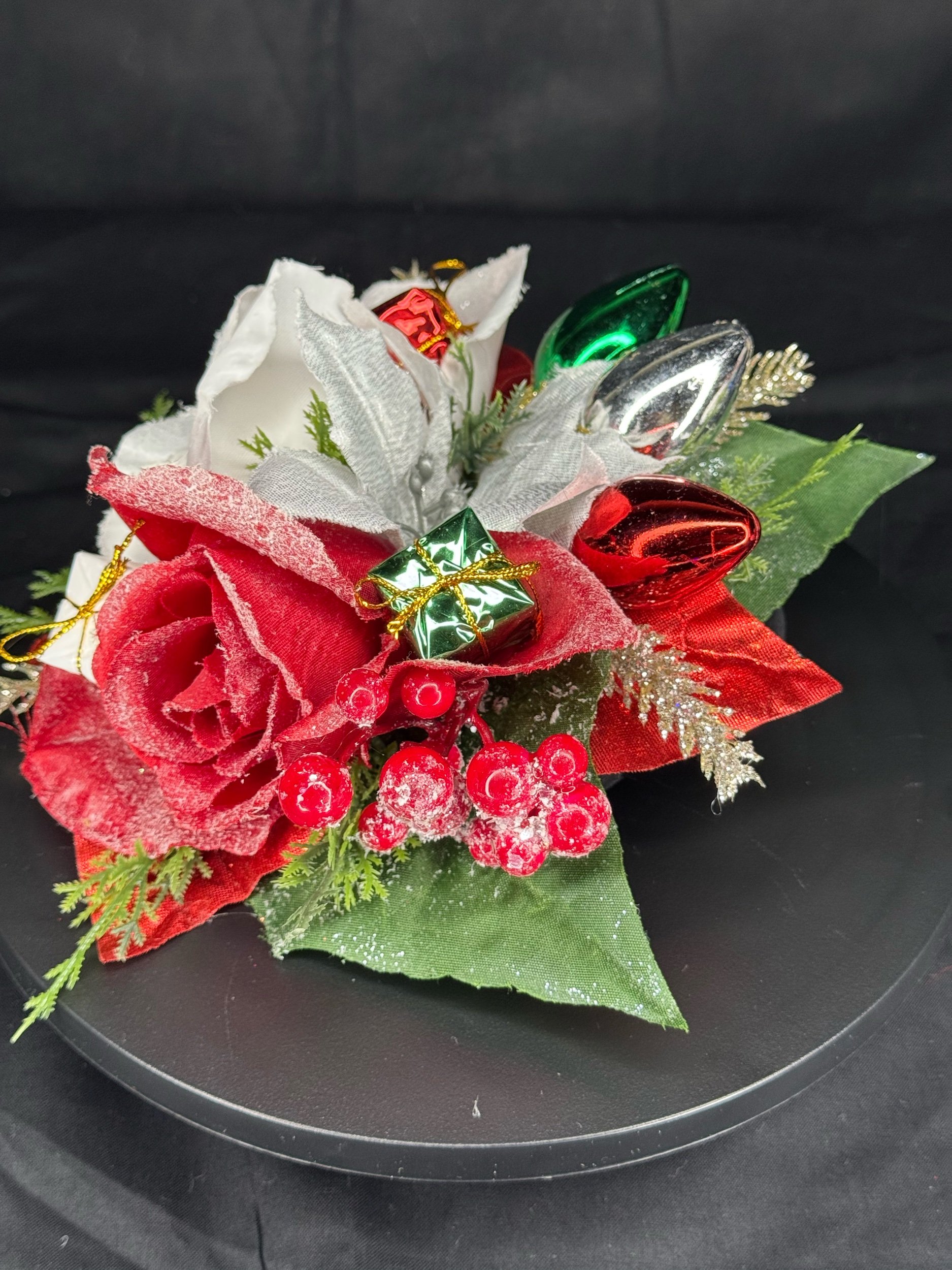 Handcrafted with layers of frosted white poinsettias, velvety red roses, and shimmering silver leaves, Griswold Grace embodies the bold beauty of a tinsel-trimmed tree. Glittering evergreen sprigs, clusters of red berries, and miniature wrapped gifts peek through the blooms, while oversized metallic “light bulb” ornaments in jewel tones add that unmistakable retro glow.