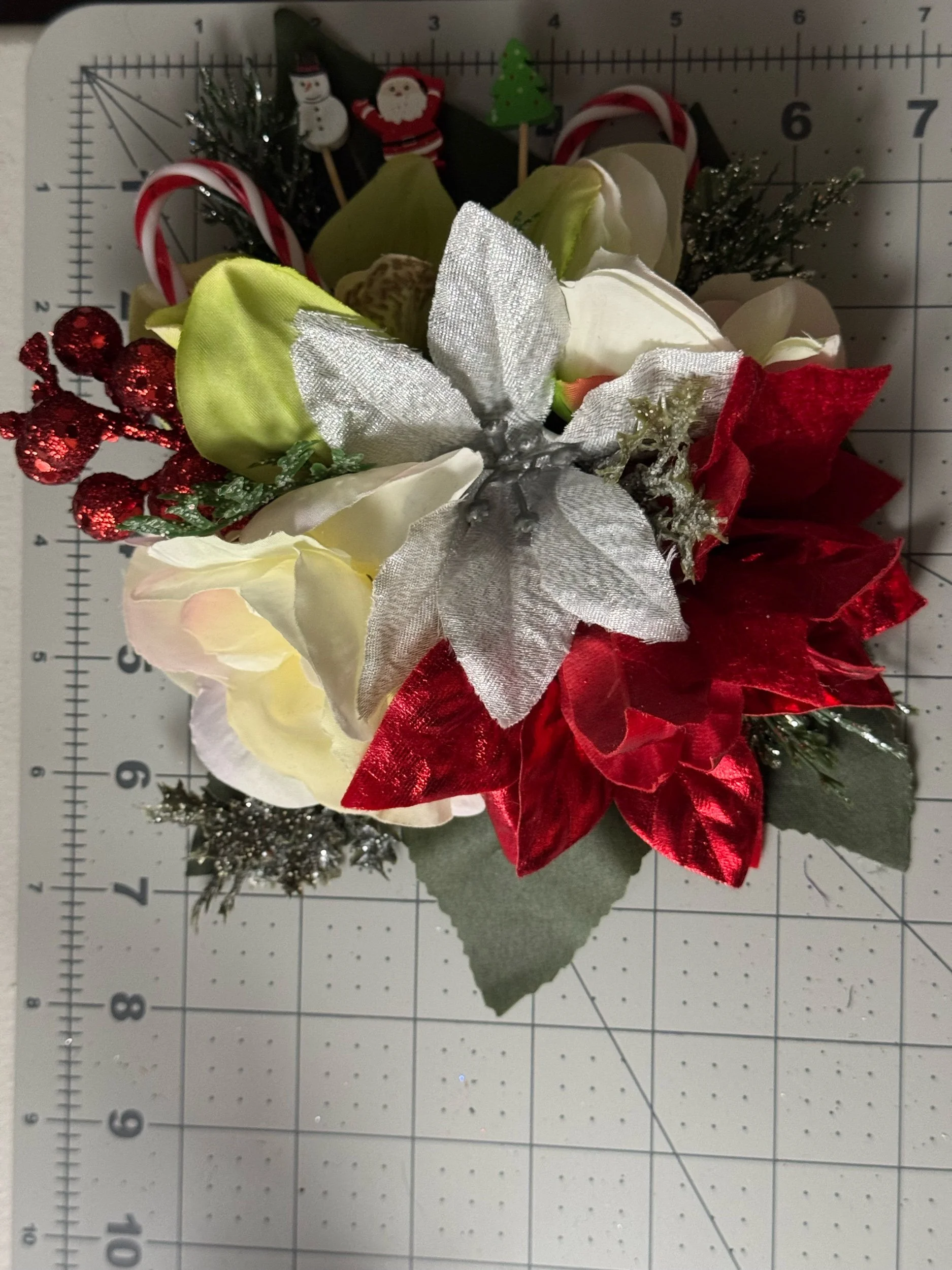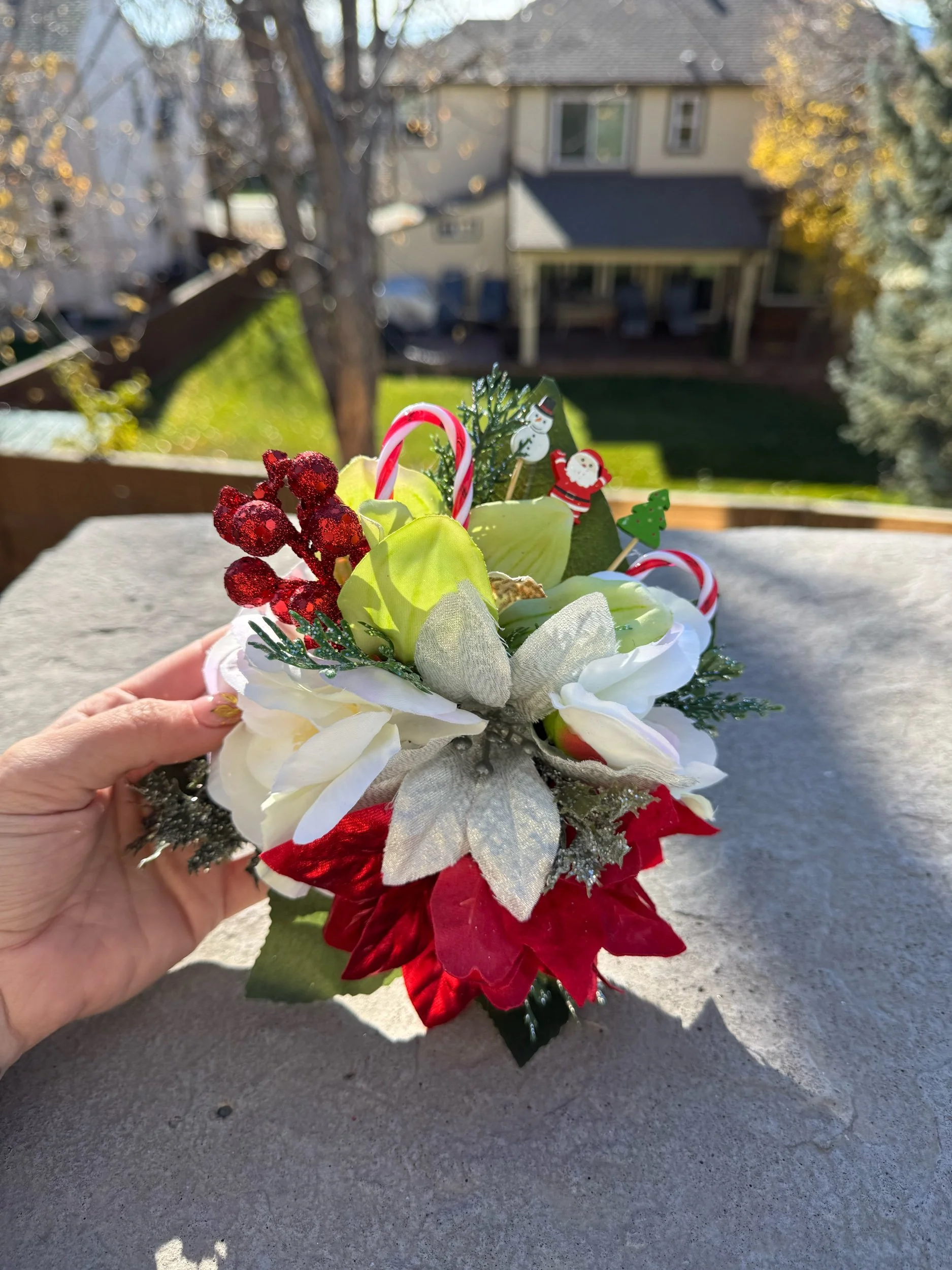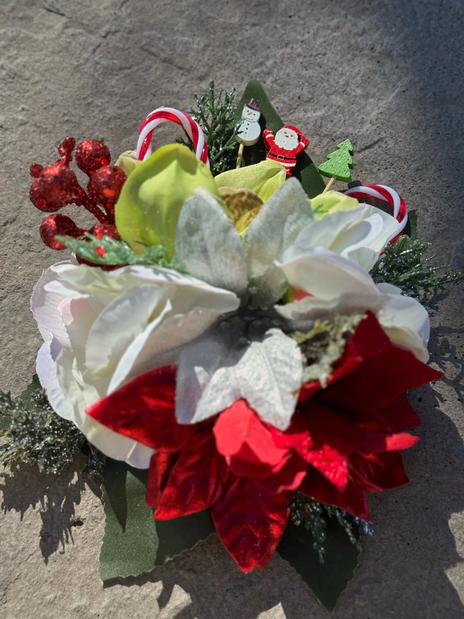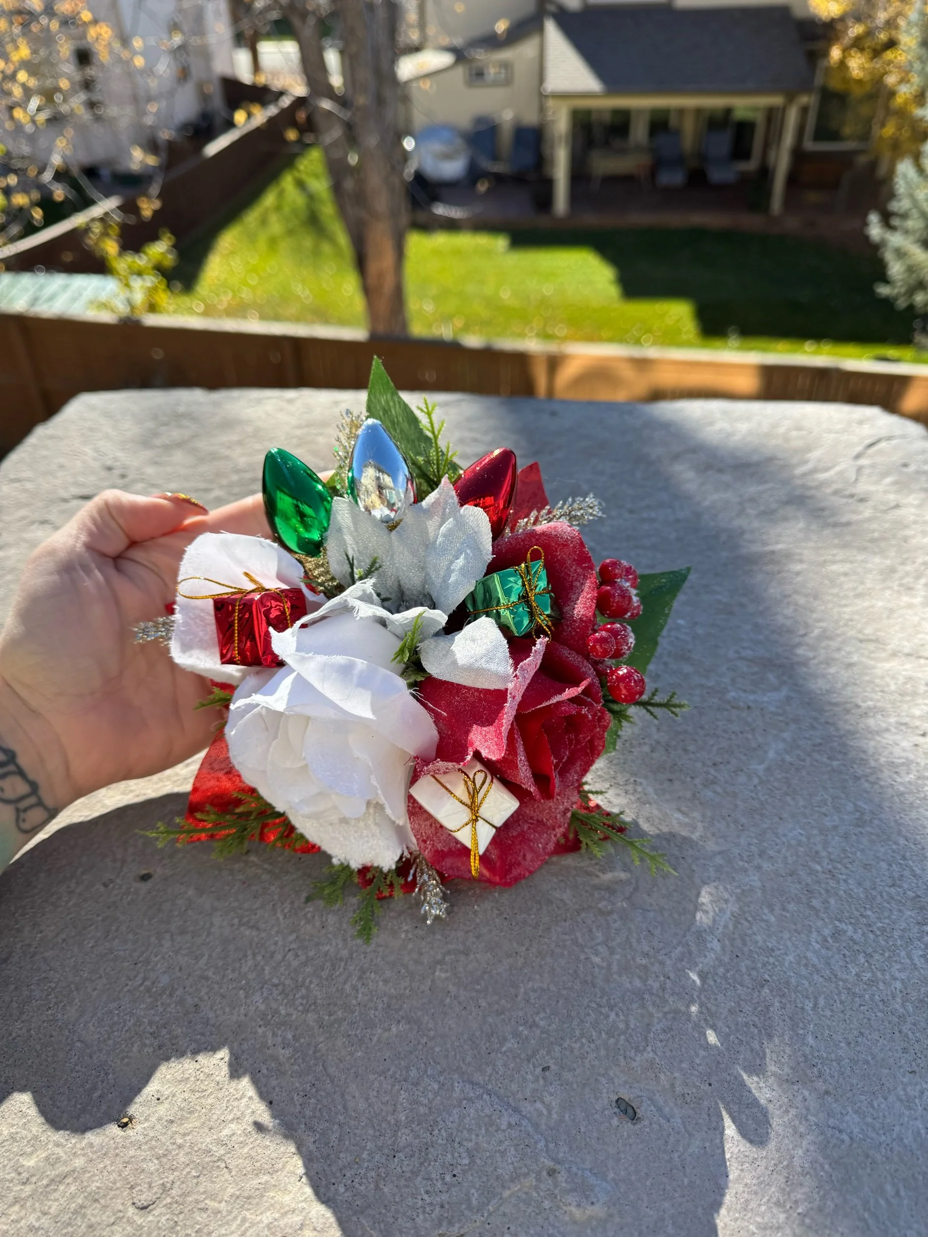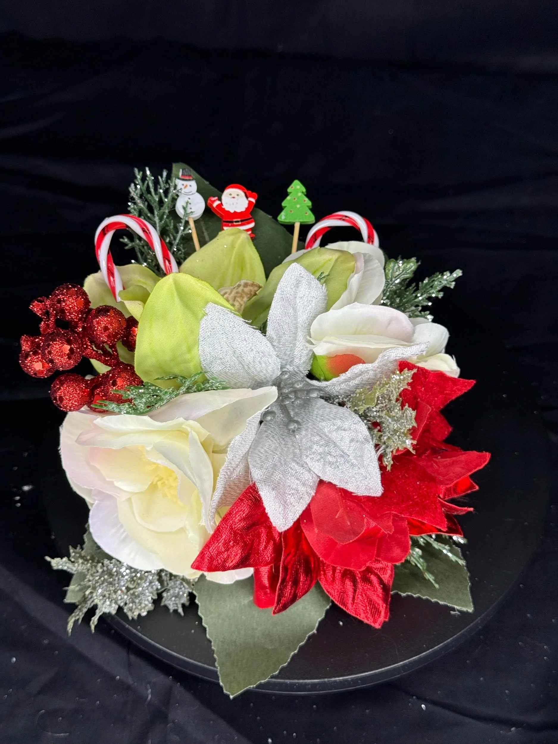 Handcrafted with layers of frosted white poinsettias, velvety red roses, and shimmering silver leaves, Griswold Grace embodies the bold beauty of a tinsel-trimmed tree. Glittering evergreen sprigs, clusters of red berries, and miniature wrapped gifts peek through the blooms, while oversized metallic “light bulb” ornaments in jewel tones add that unmistakable retro glow.