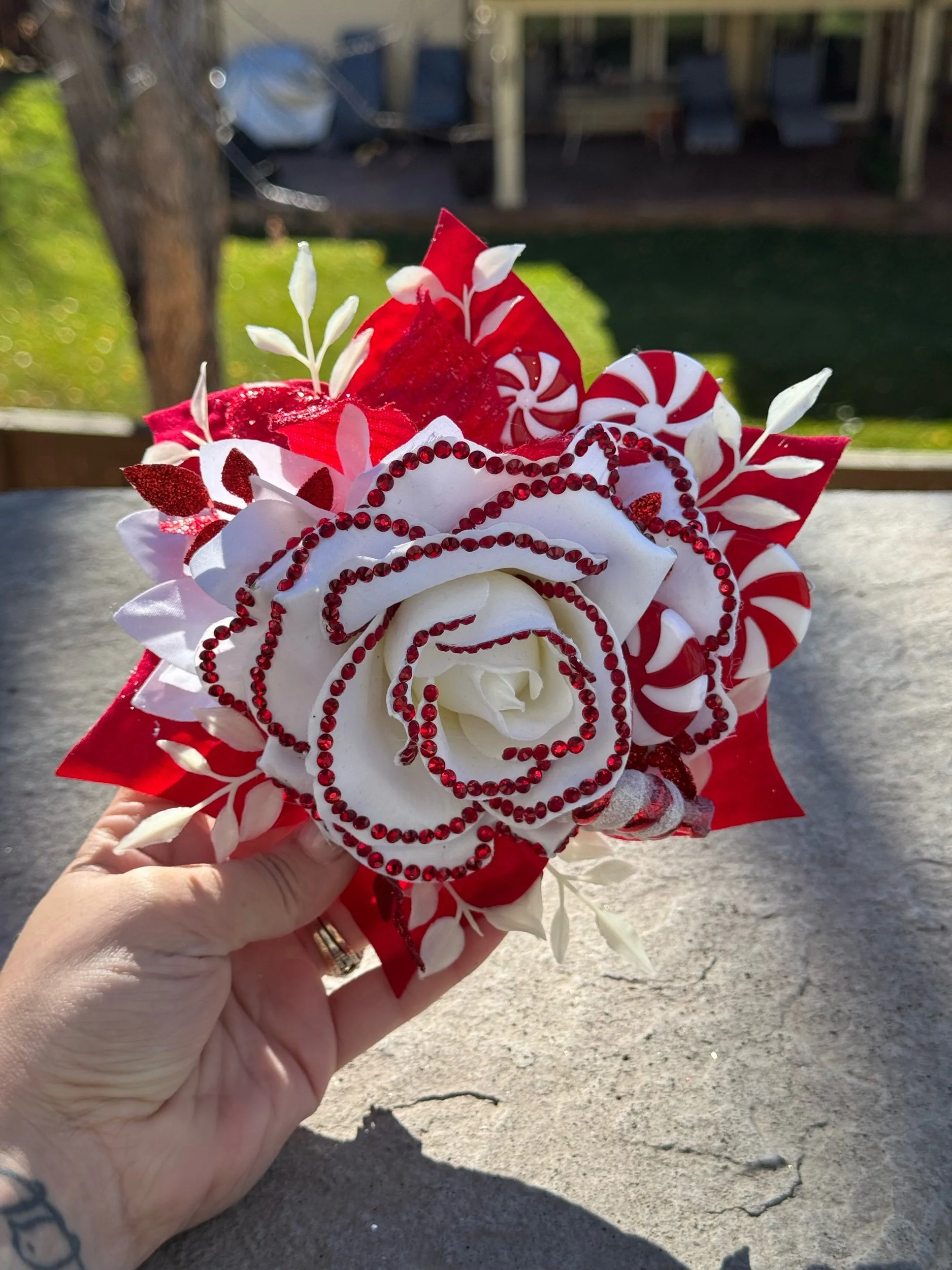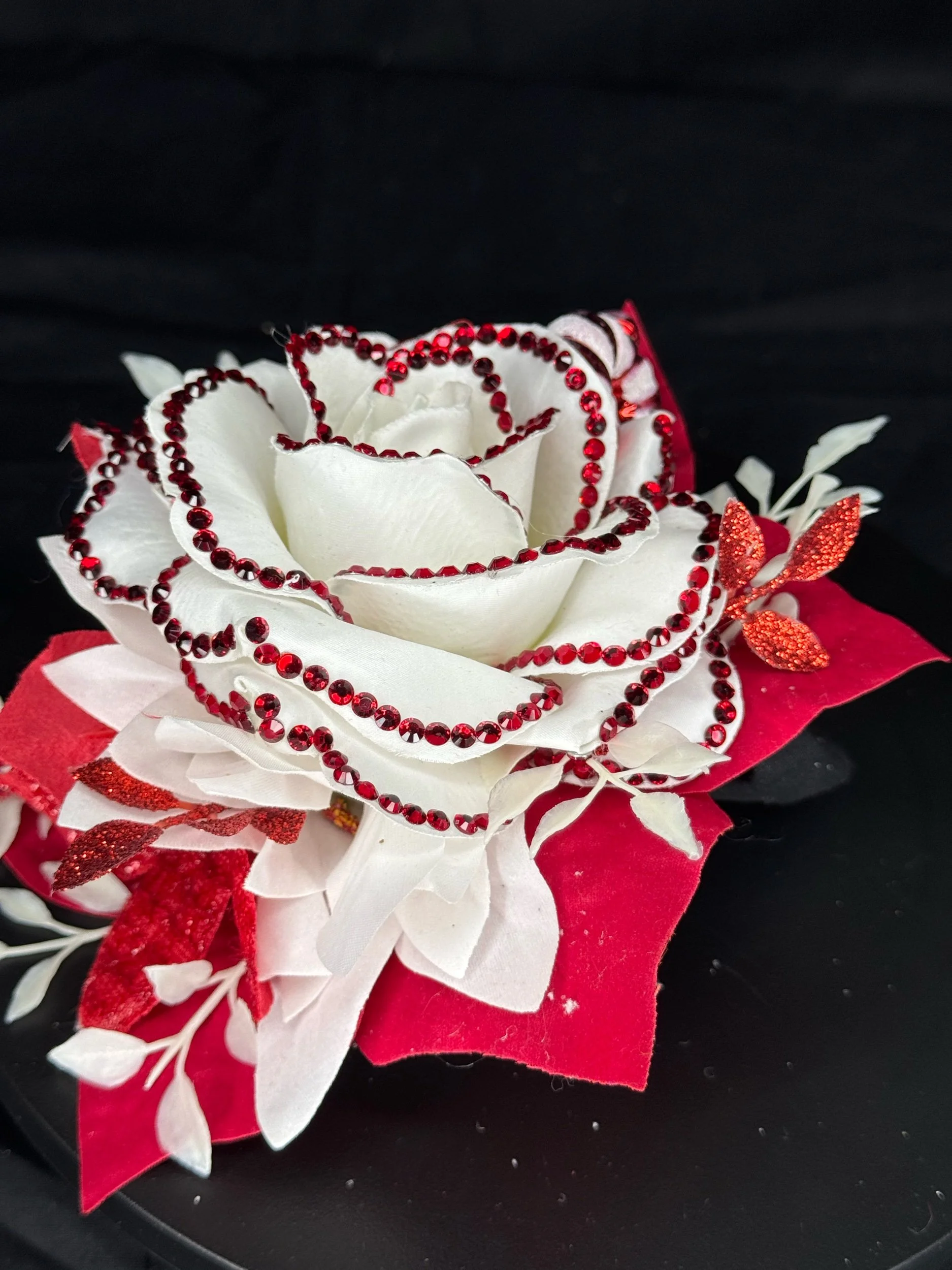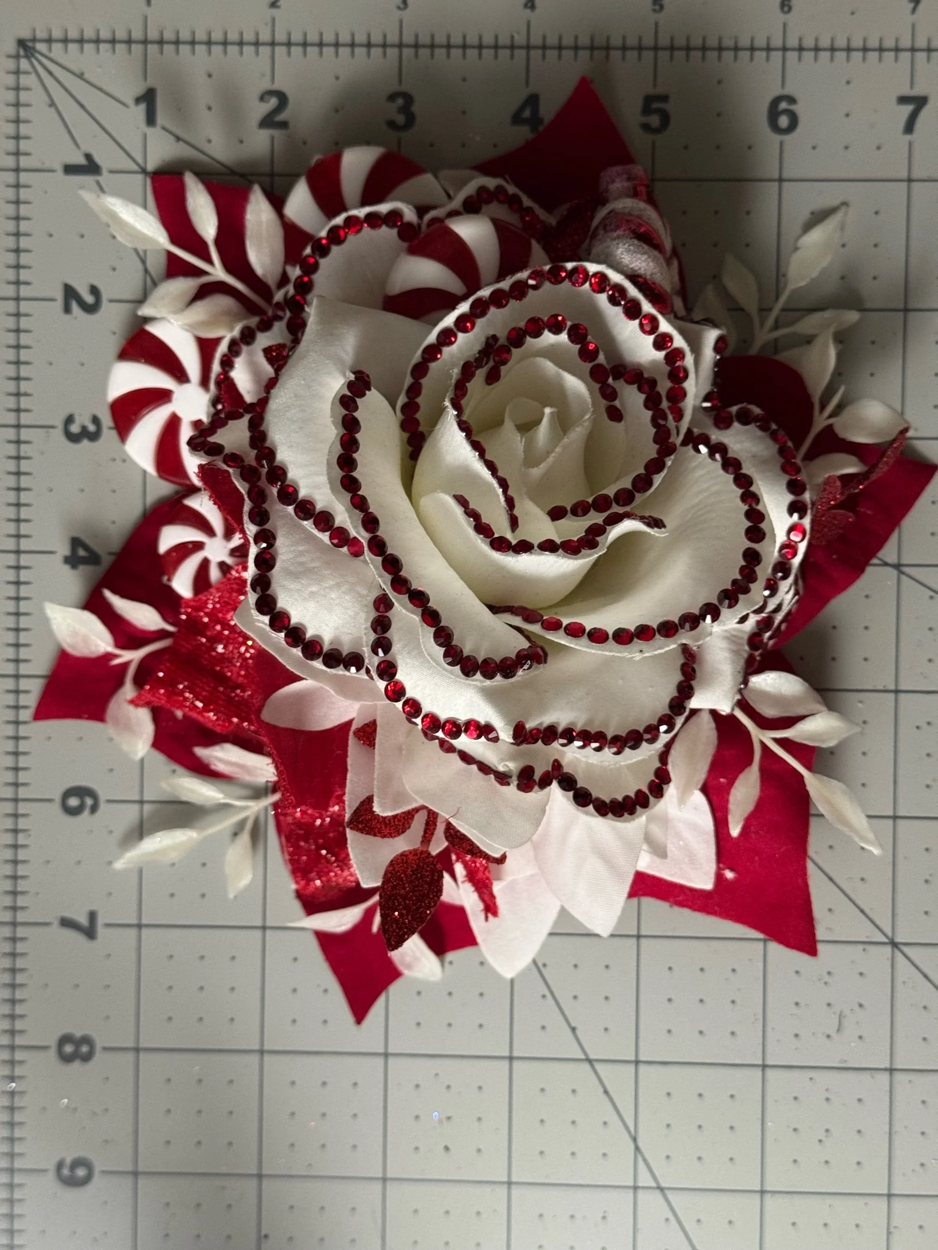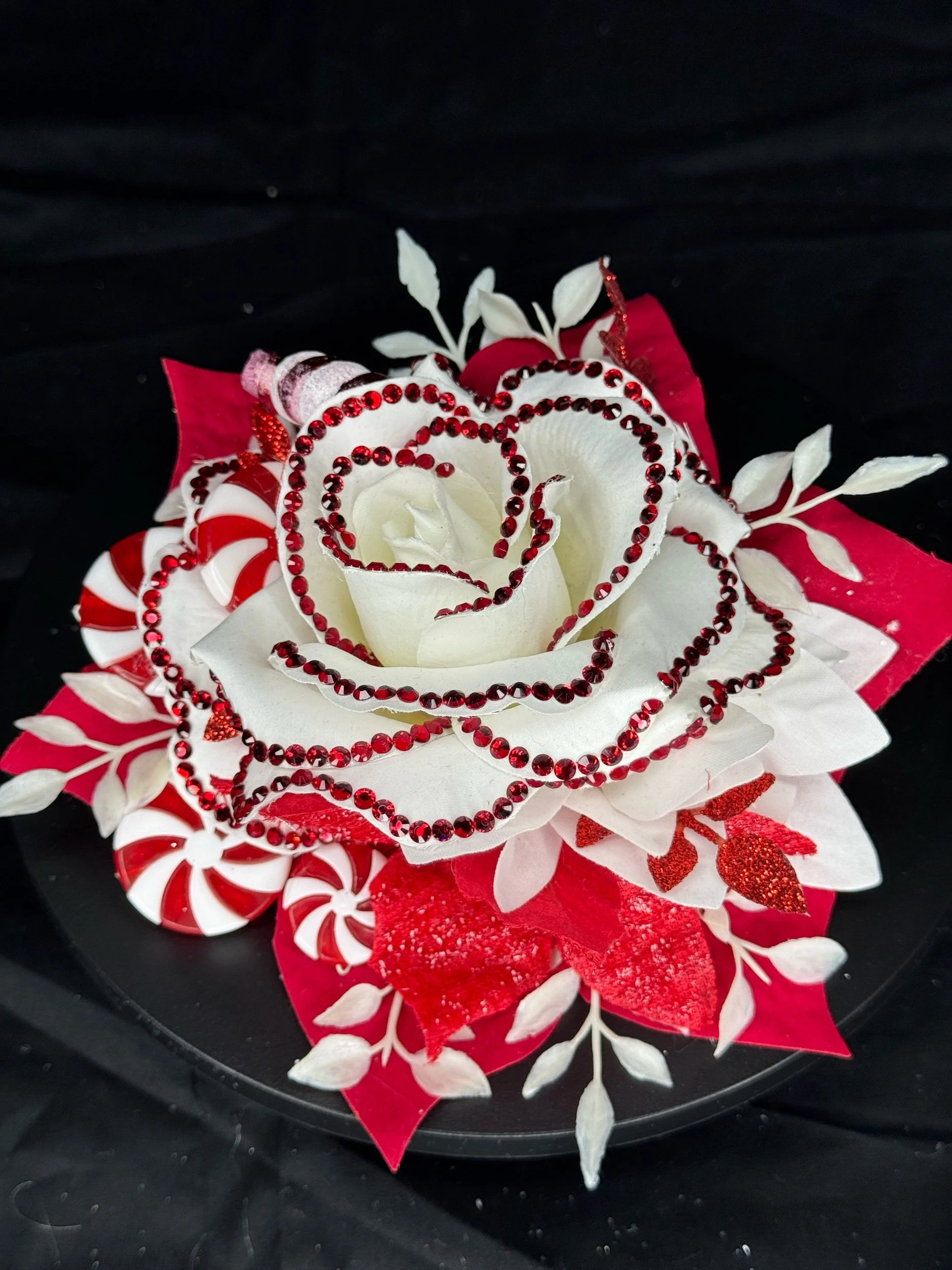 Features layered red and white florals with frosted and metallic accents