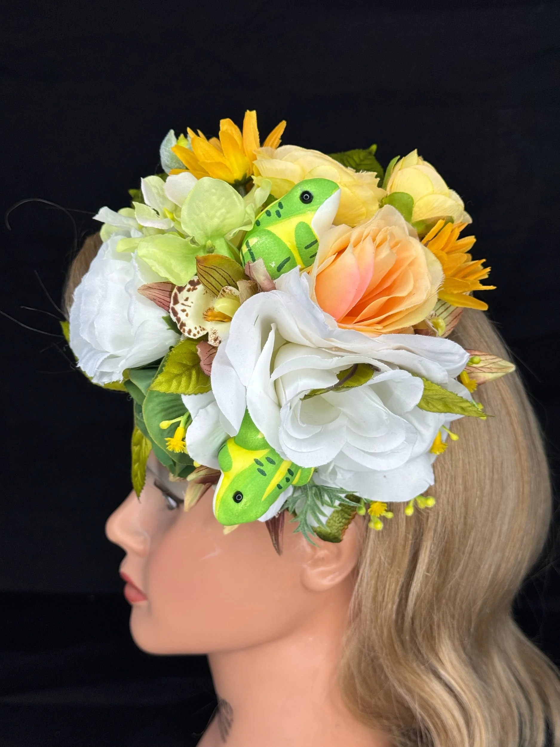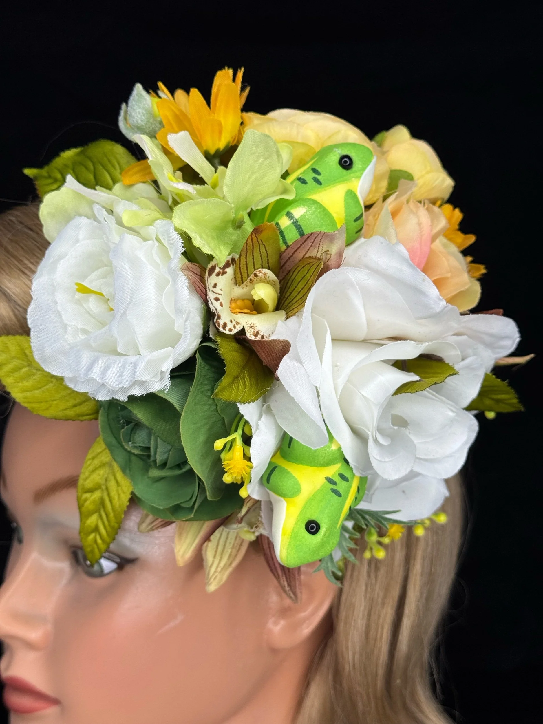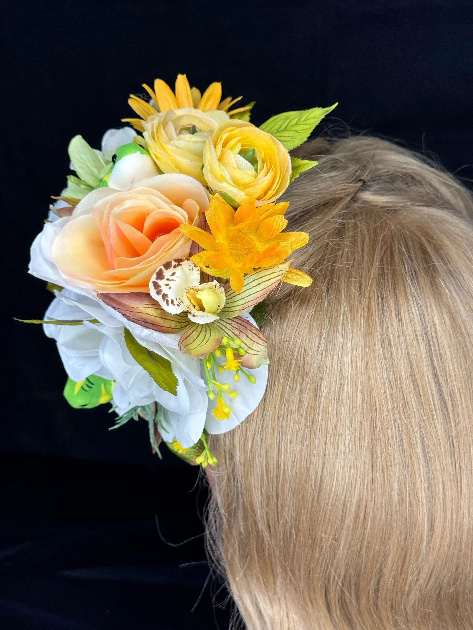 Materials: Silk and foam florals, synthetic greenery, lightweight decorative frogs, secure hair attachment.