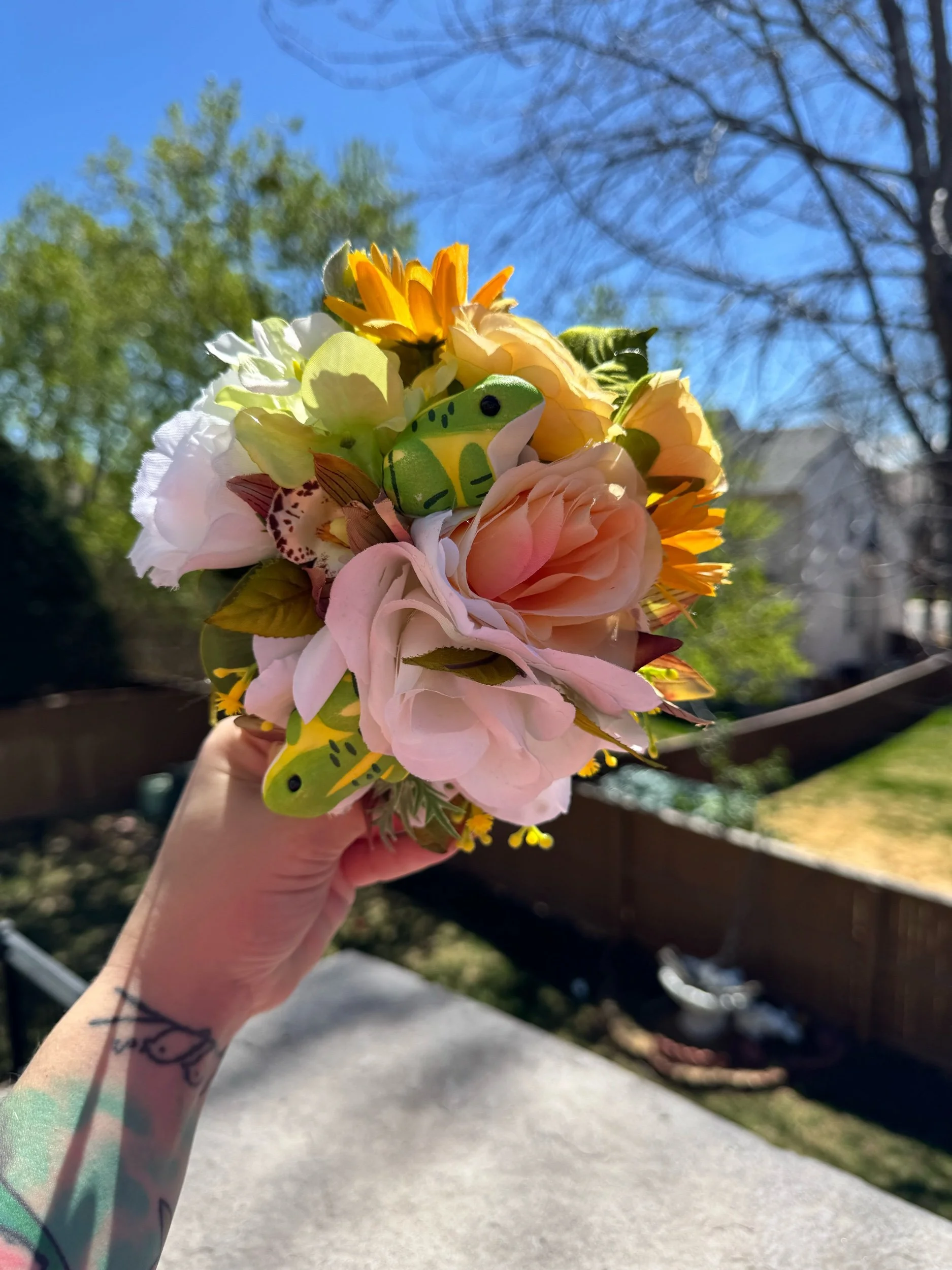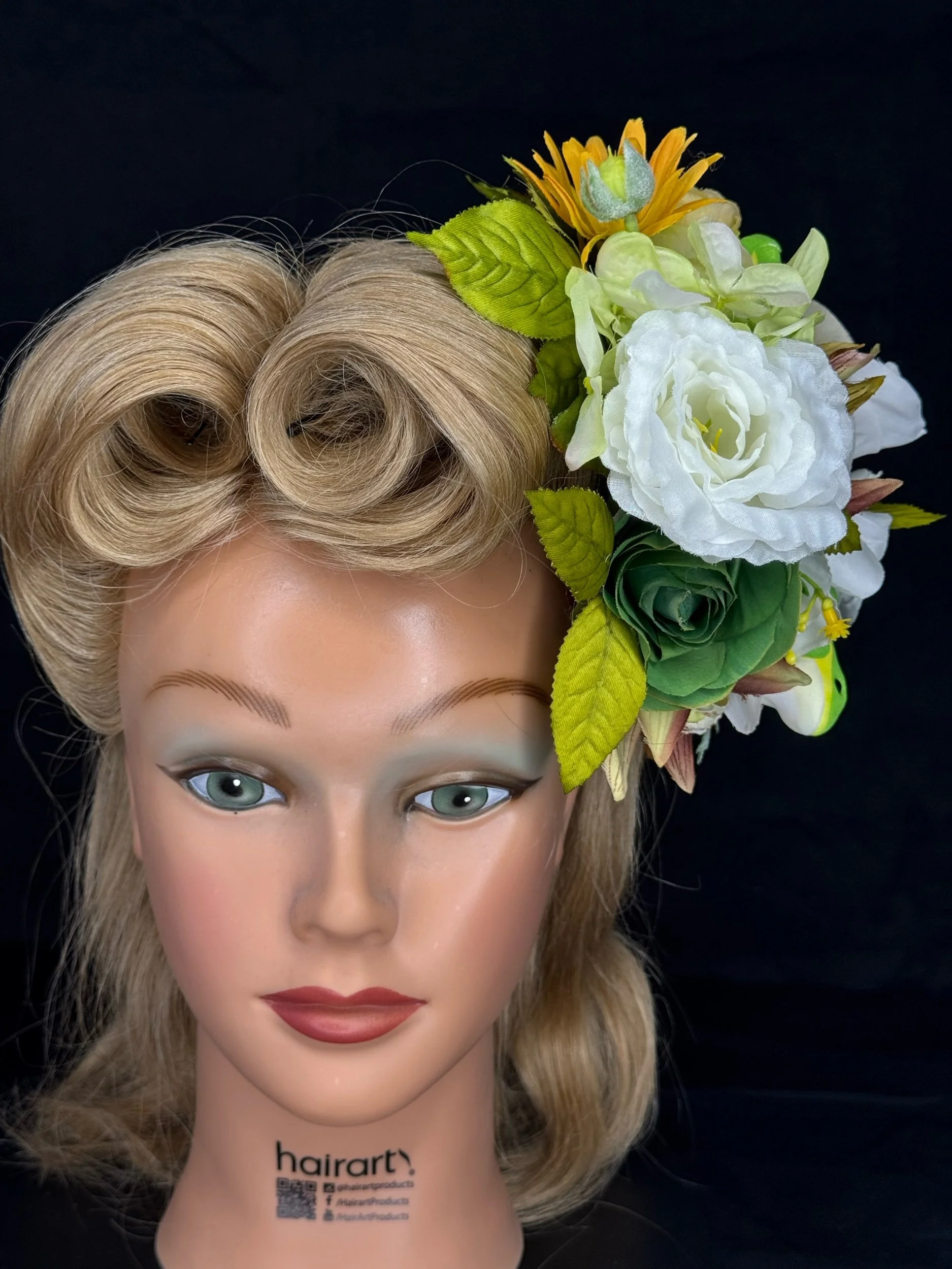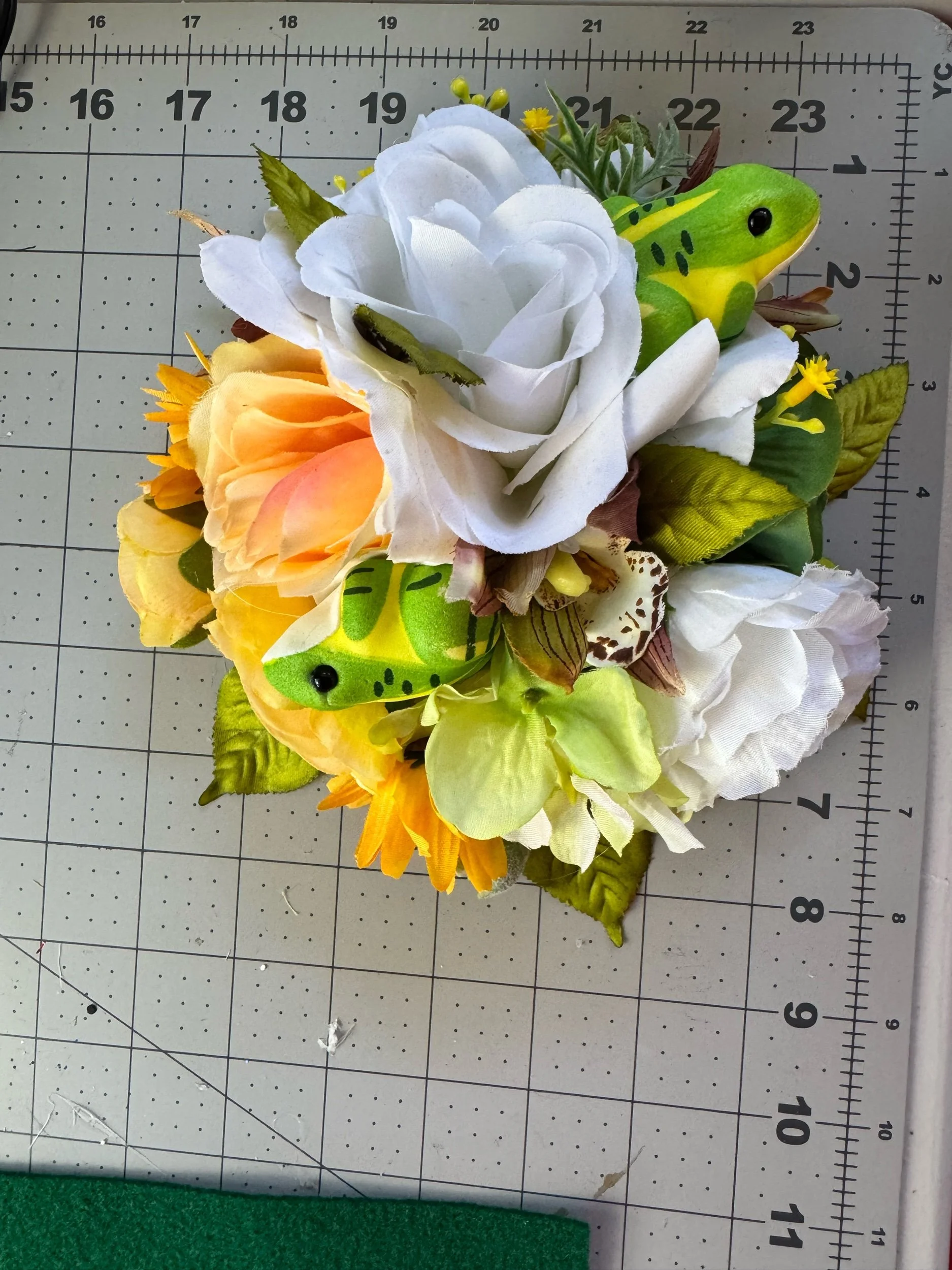 Materials: Silk and foam florals, synthetic greenery, lightweight decorative frogs, secure hair attachment.