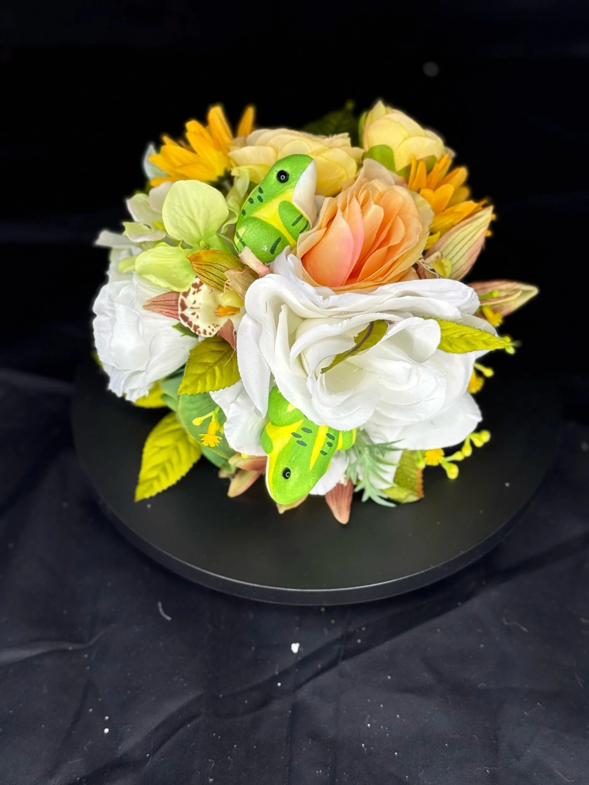 • Artisanal Craftsmanship: Each petal, leaf, and frog is meticulously placed to ensure a balanced, voluminous silhouette that looks stunning from every angle.